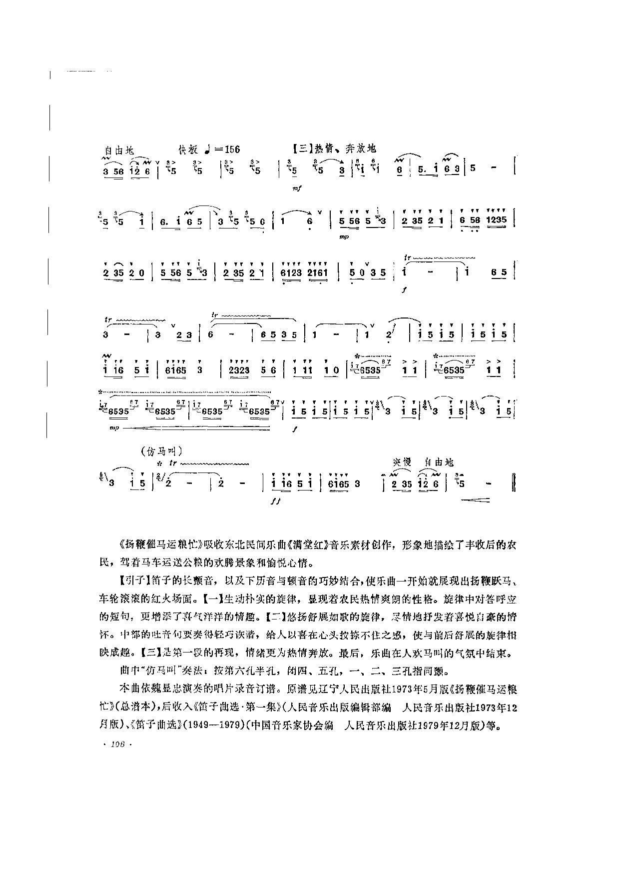 【引子1笛子的长颤音,以及下历音与顿音的巧妙结合,使乐曲一开始就展现出扬鞭跃马车轮滚滚的红火场面。【一】生动朴实的旋律,显现着农民热情爽朗的性格。旋律中对答呼应的短句,更增添了喜气洋洋的情趣。【二】悠扬舒展如歌的旋律,尽情地抒发着喜悦自豪的情怀。中部的吐齐们要奏得轻巧读谐,给人以喜在心头按捺不住之感,使与前后舒展的旋律映成趣。【三】是第一段的再现,情绪更为热情奔放。最后,乐曲在人欢马叫的气中结束。