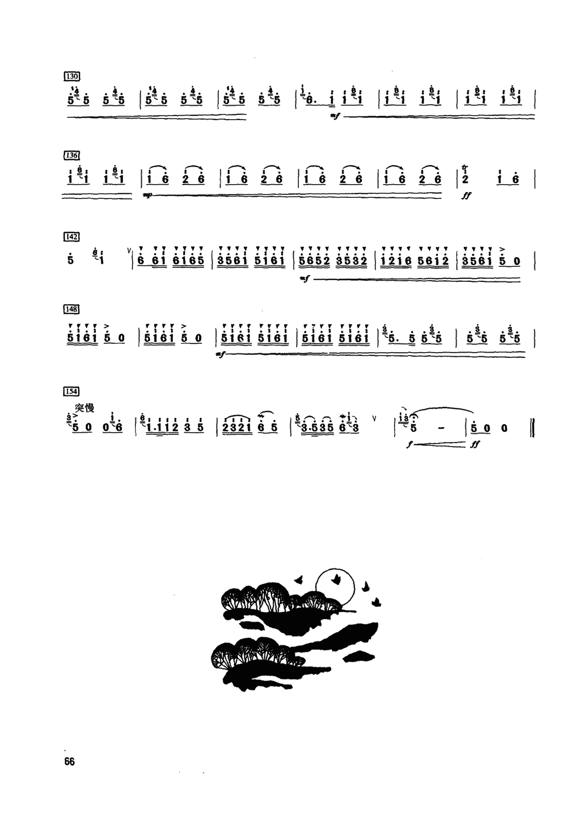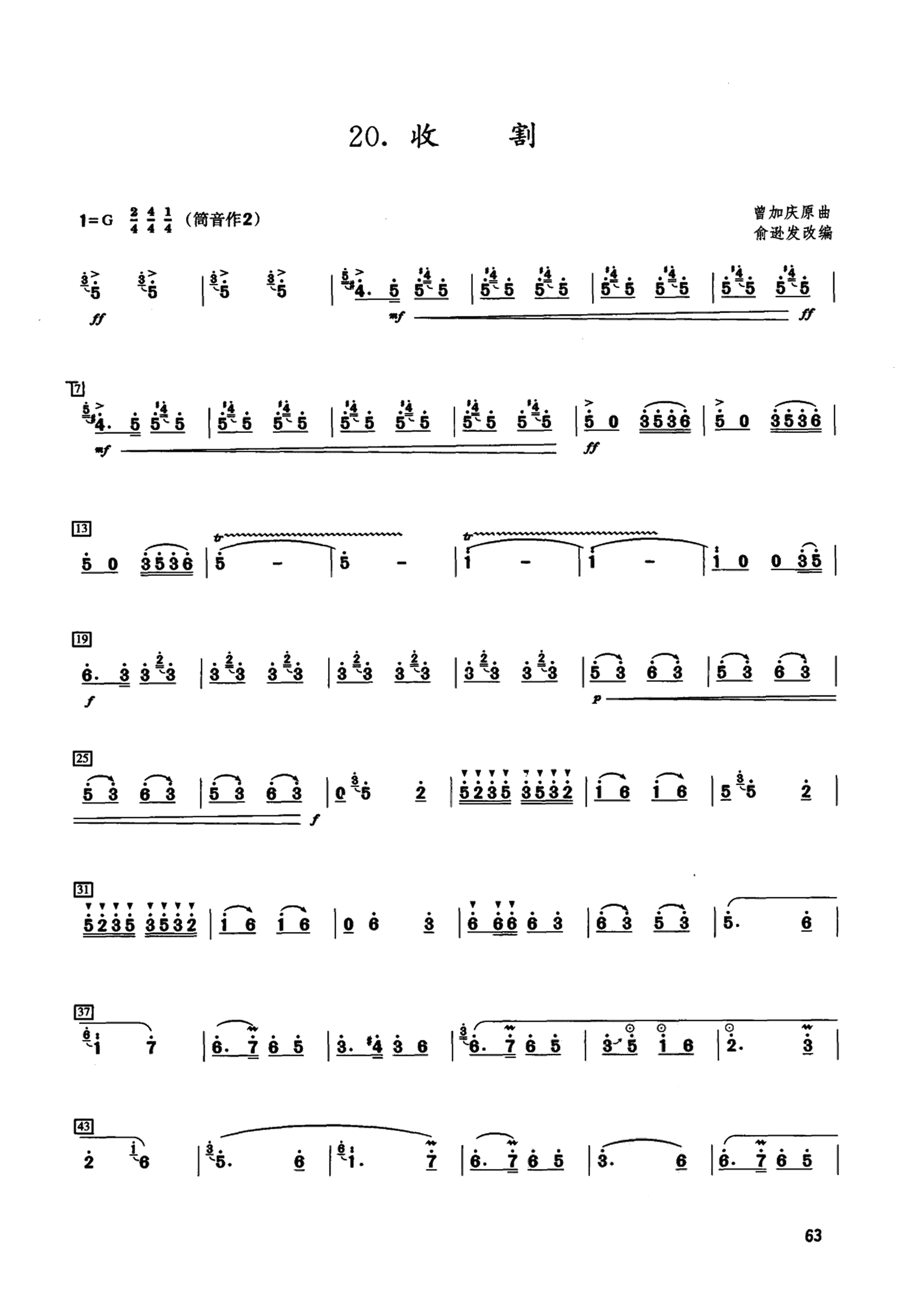《收割》本曲是俞逊发于1973年根据曾加庆原作于1960年的板胡曲(后于1964年改编成弹拨乐合奏)改编而成的一首笛子独奏曲。乐曲生动地描写了农民们在农忙收割时火热的劳动场面,全曲的强弱变化较大,中段的歌唱性旋律极富浙江婺剧的韵味。演奏时要做到双吐音速度快、弹性好,中段更要求能用梆笛吹奏出曲笛的音色,所以风门、口劲及气息的配合都需要专门训练。