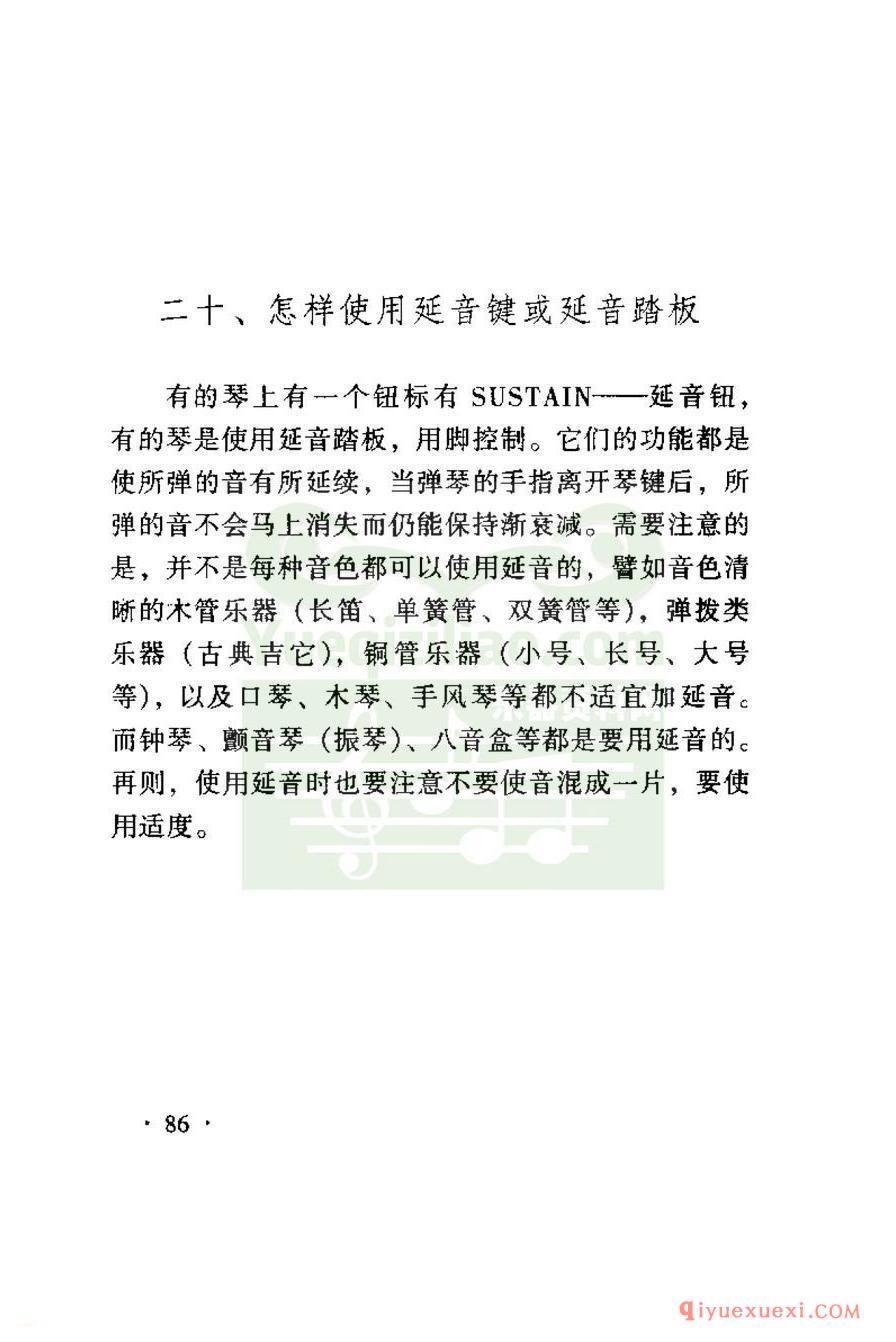 有的琴上有一个钮标有SUSTAIN-—延音钮,有的琴是使用延音踏板,用脚控制。它们的功能都是使所弹的音有所延续,当弹琴的手指离开琴键后,所弹的音不会马上消失而仍能保持渐衰减。需要注意的是,并不是每种音色都可以使用延音的,譬如音色清晰的木管乐器(长笛、单簧管、双簧管等),弹拨类乐器(古典吉它),铜管乐器(小号、长号、大号等),以及口琴、木琴、手风琴等都不适宜加延音。而钟琴、颤音琴(振琴)、八音盒等都是要用延音的。再则,使用延音时也要注意不要使音混成一片,要使用适度。