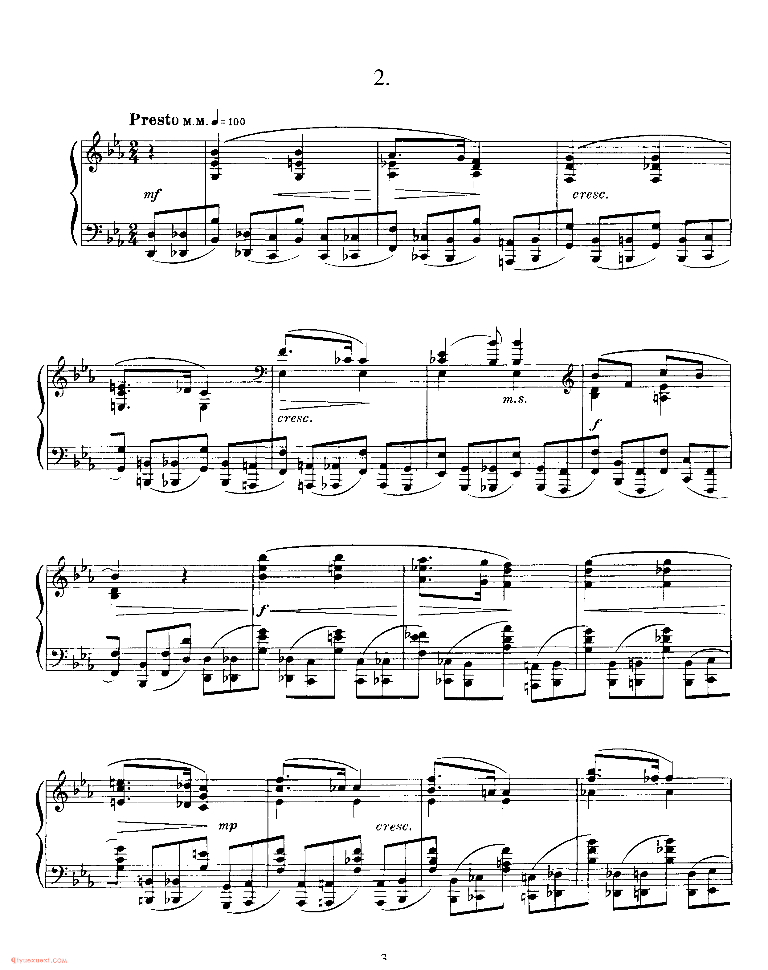 2. 降E大调,2/4拍,急板。焦虑不安的情绪,宛如一首左手八度练习曲。