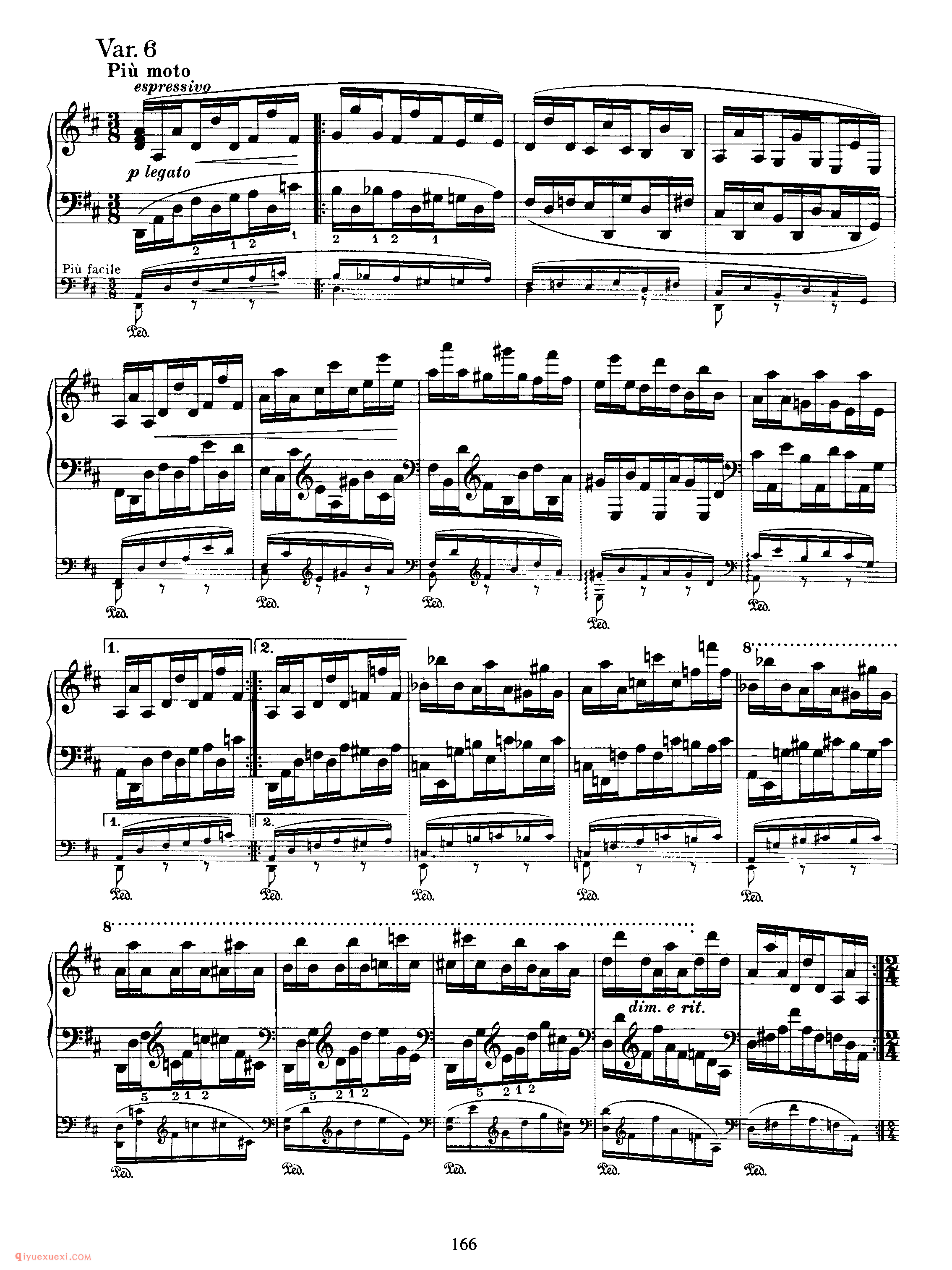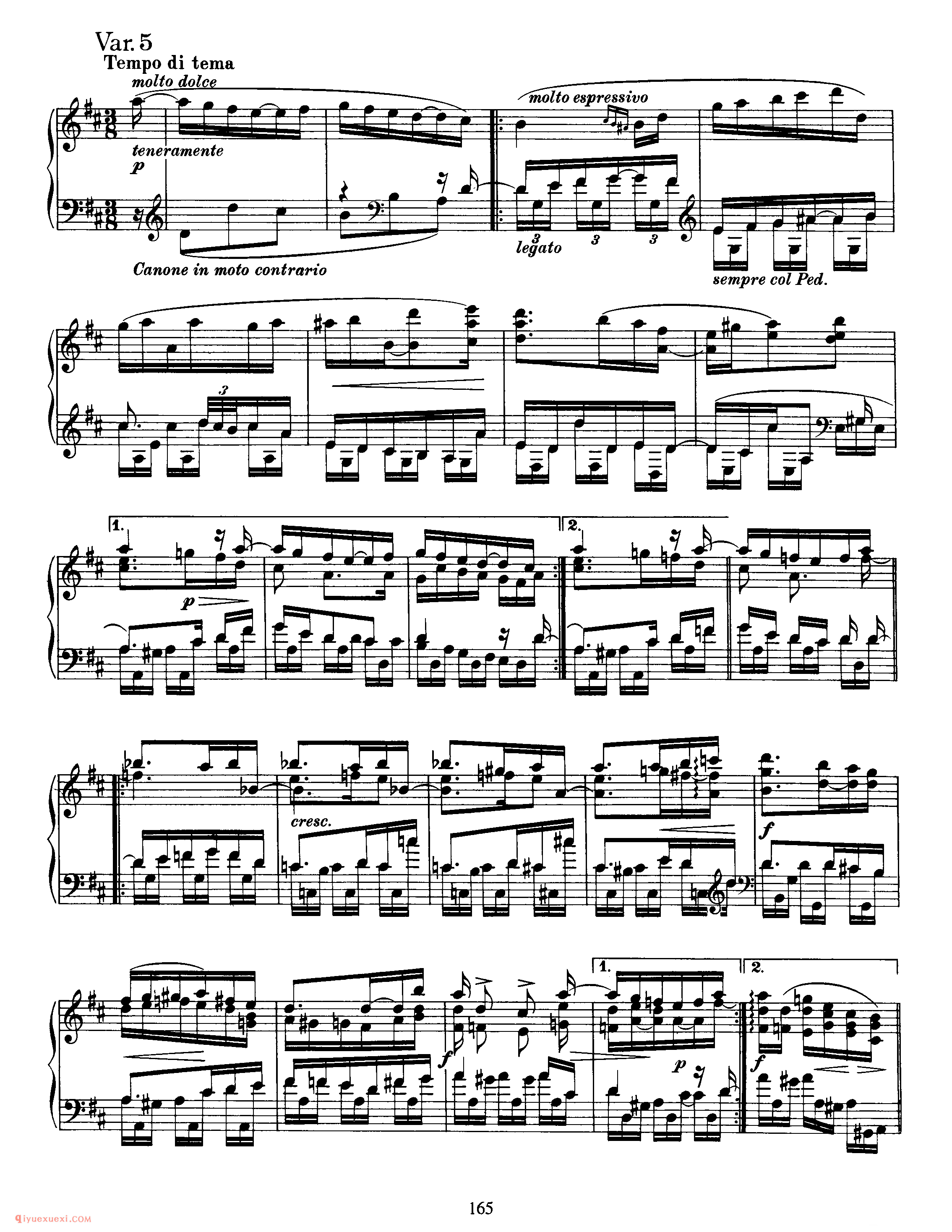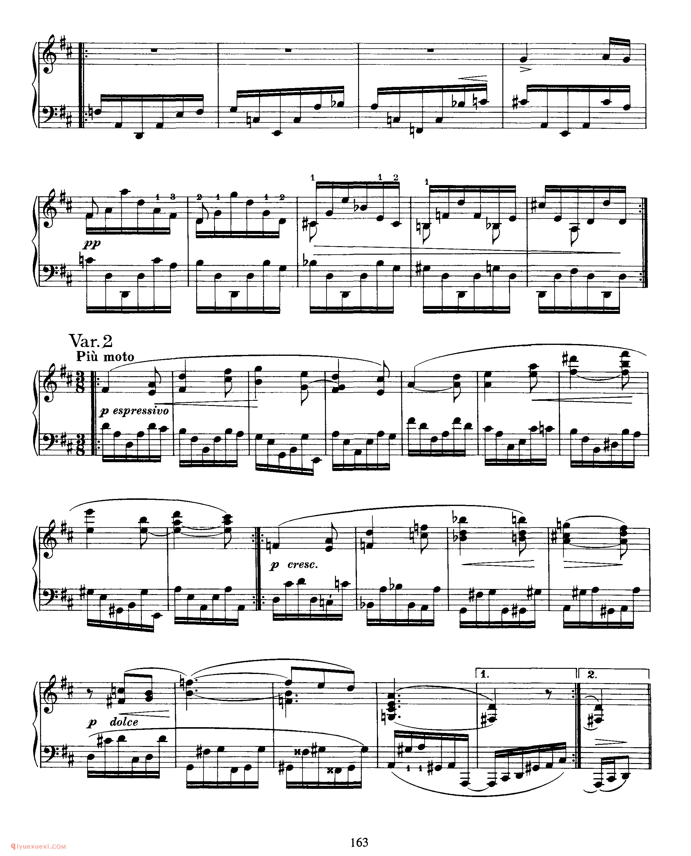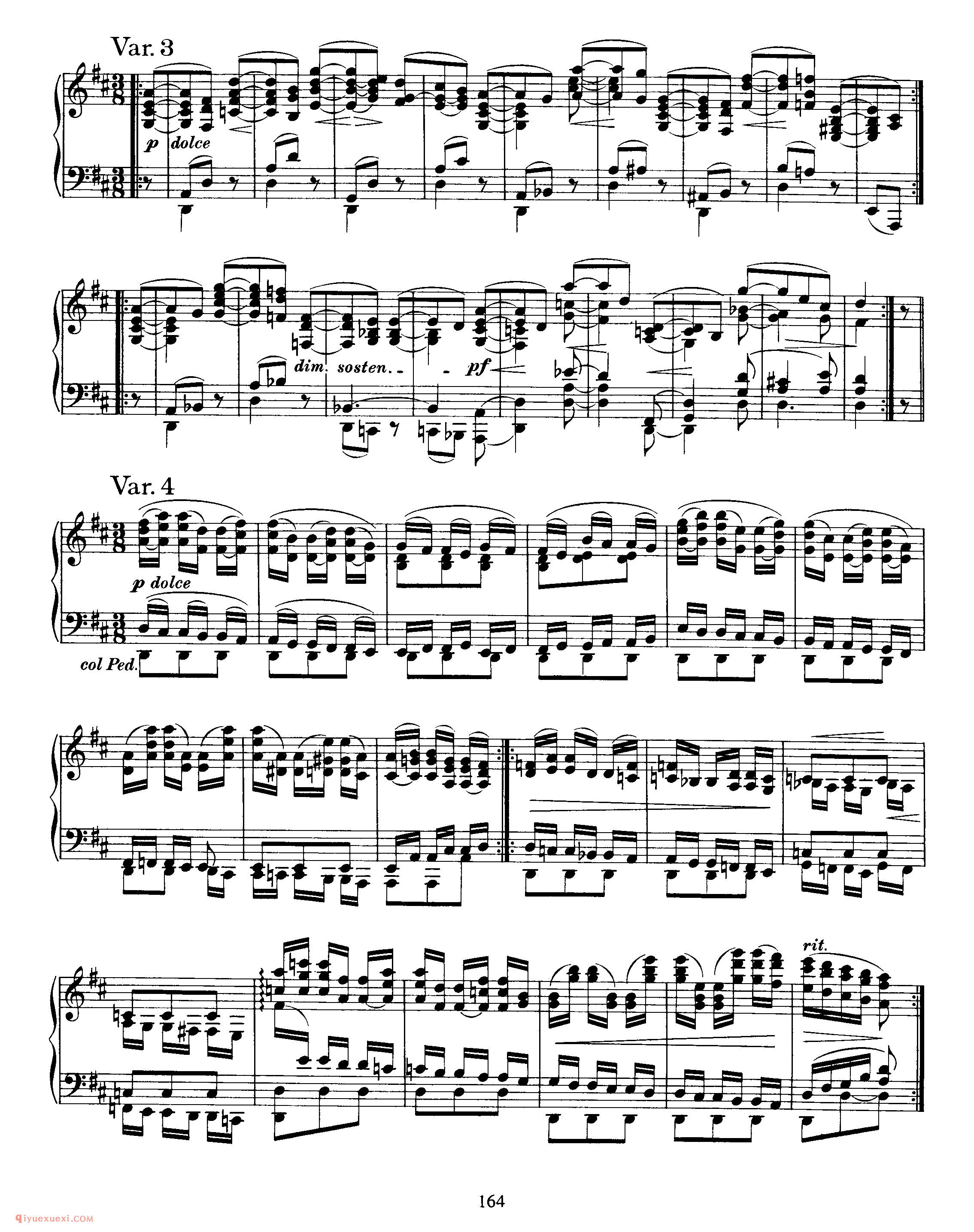 此曲由主题部分及其十一次变奏和尾声构成 。主题,D大调,广板,3/8拍,庄严的歌唱性音乐,再现单二部曲式 。A乐段 (4+5)为对比关系非方整性的开放性乐段,B乐段 (4+5)为对比关系非方整性的收拢性乐段,A、B乐段都分别作反复,主题从弱起小节开始,在主持续音的映衬下一点一点的加强,柱立式织体结构,低音声部有音阶式的推动,在B乐段出现时,转入F大调,三个小节的发展后回到主调性。 变奏一,调性与结构的布局与主题一样,整体织体变薄,大范围使用十六分音符进行,左手低音分解和弦慢慢的出现,四小节后右手声部出现,左右手相同的十六分音符的律动进行,右手大量的分解和弦中隐藏着音阶流动的旋律的发展。 变奏二,由原本的弱起拍发展为正拍开始,主题的轮廓非常清晰,由最初的八分音符发展为由四分音符和八分音符相结合的节奏型,拉伸了旋律的线条,使右手的旋律更赋歌唱性。变奏三,切分节奏出现,将前一小节的弱拍延留到下一小节的强拍,打破了节拍的强弱规律,给人听觉上一个新的音乐形 象,织体变厚,音乐集中。