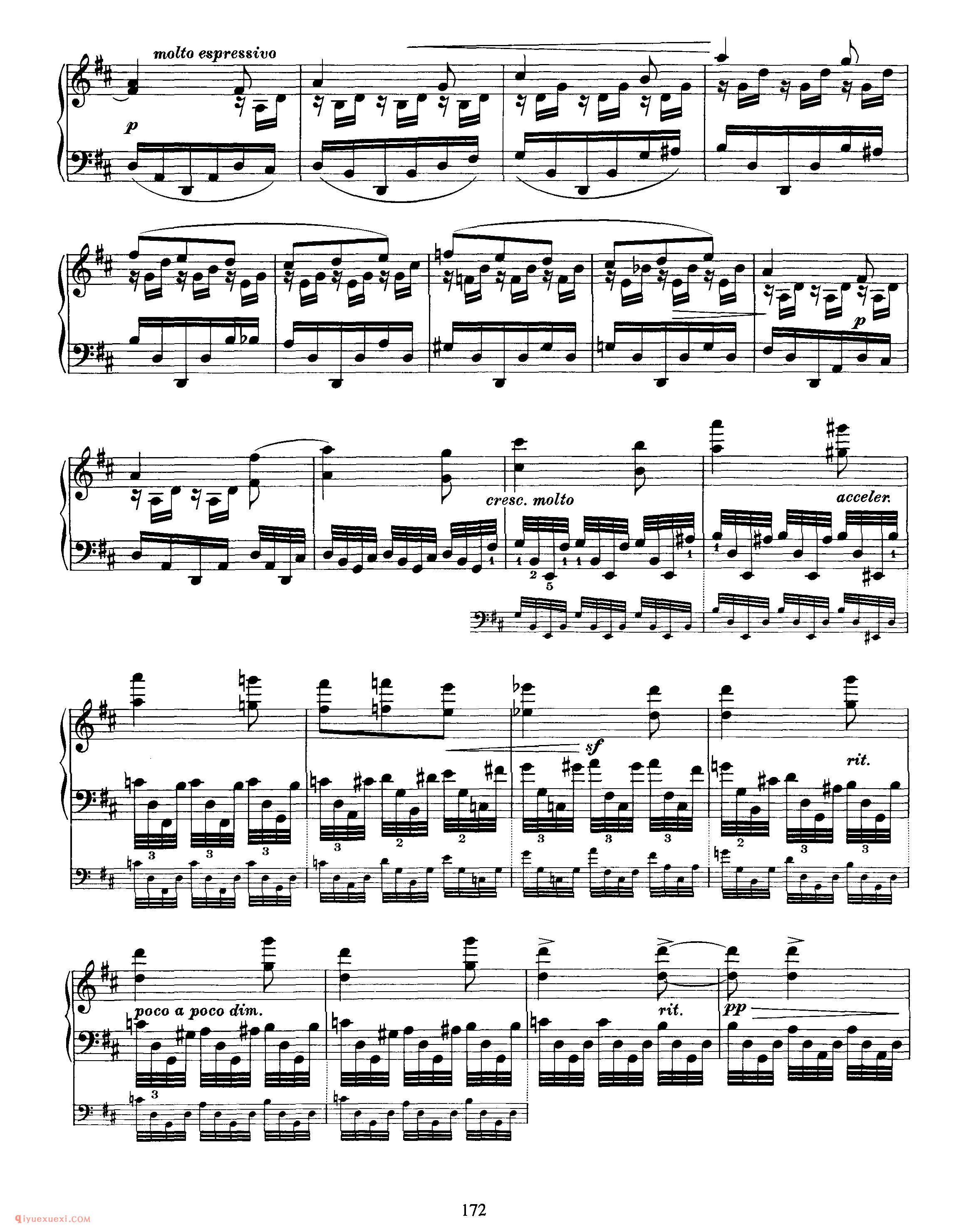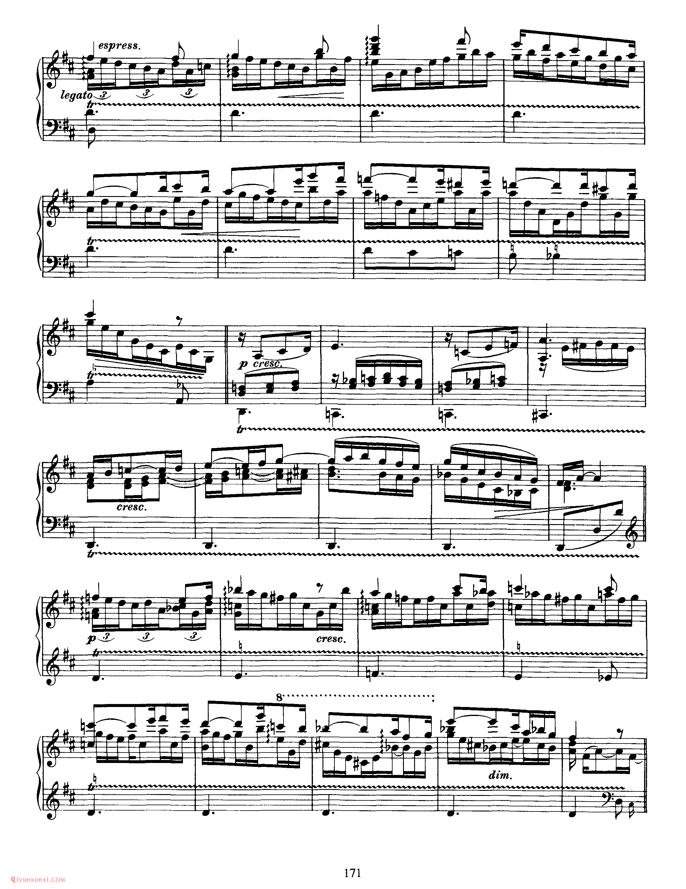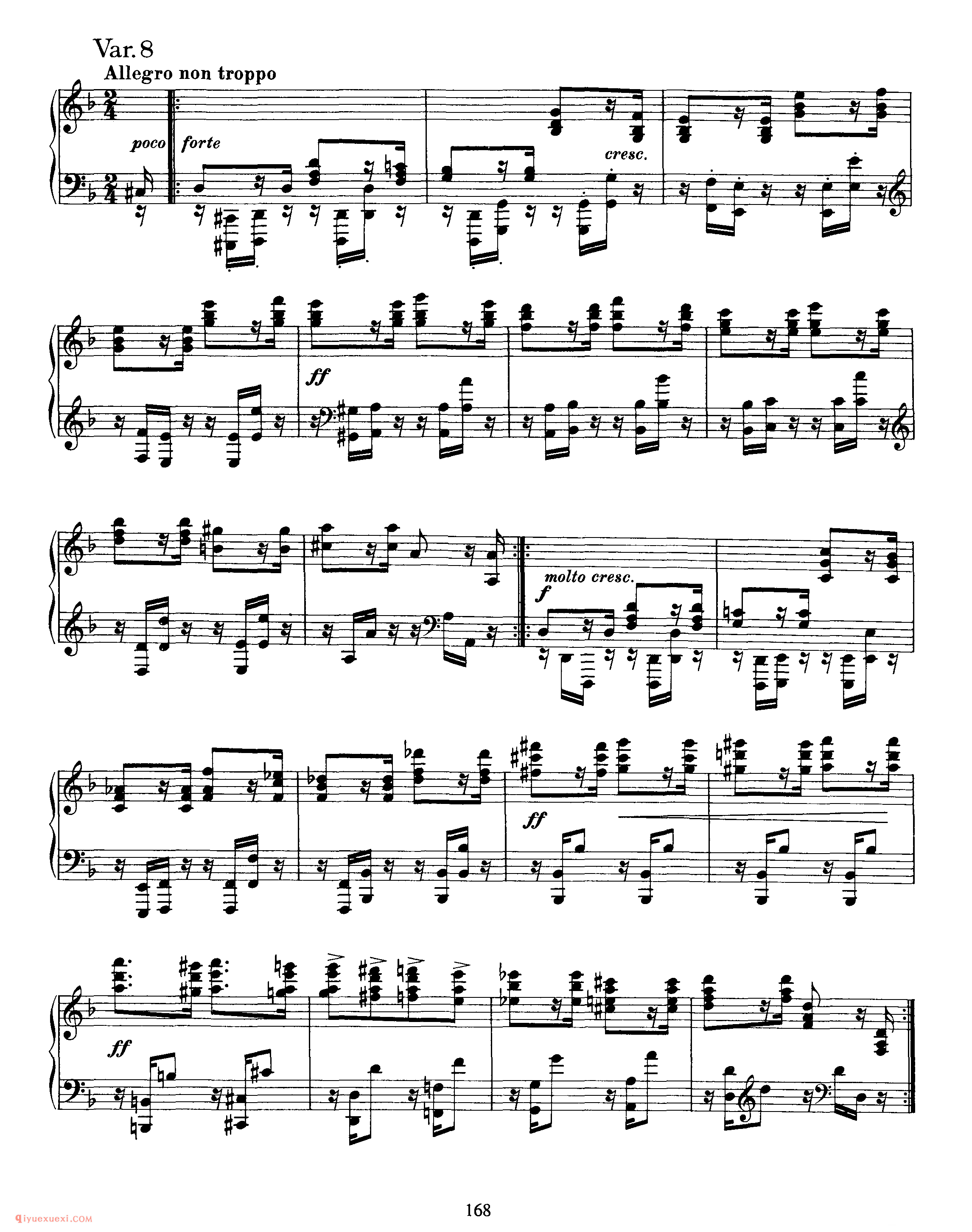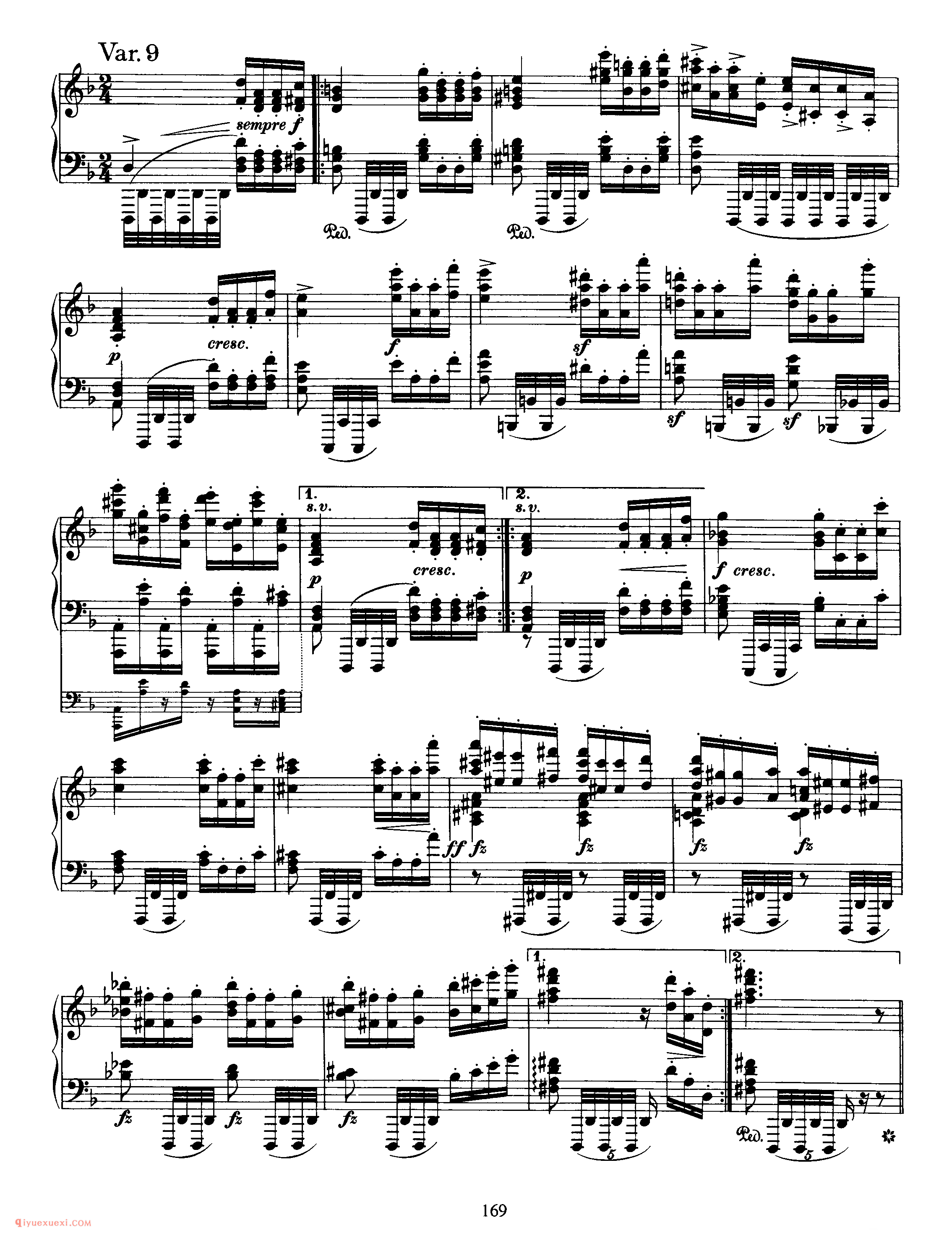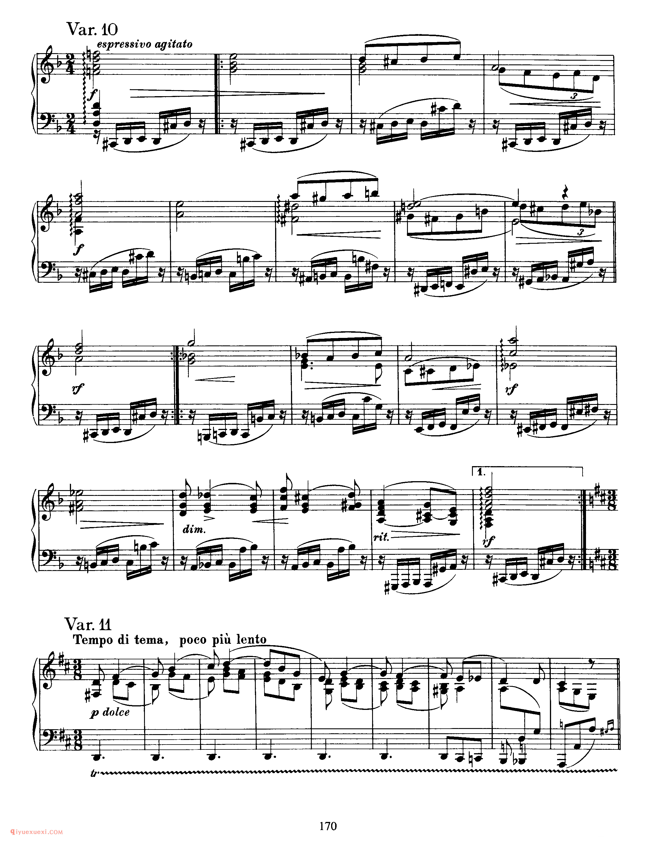 此曲由主题部分及其十一次变奏和尾声构成 。主题,D大调,广板,3/8拍,庄严的歌唱性音乐,再现单二部曲式 。A乐段 (4+5)为对比关系非方整性的开放性乐段,B乐段 (4+5)为对比关系非方整性的收拢性乐段,A、B乐段都分别作反复,主题从弱起小节开始,在主持续音的映衬下一点一点的加强,柱立式织体结构,低音声部有音阶式的推动,在B乐段出现时,转入F大调,三个小节的发展后回到主调性。 变奏一,调性与结构的布局与主题一样,整体织体变薄,大范围使用十六分音符进行,左手低音分解和弦慢慢的出现,四小节后右手声部出现,左右手相同的十六分音符的律动进行,右手大量的分解和弦中隐藏着音阶流动的旋律的发展。 变奏二,由原本的弱起拍发展为正拍开始,主题的轮廓非常清晰,由最初的八分音符发展为由四分音符和八分音符相结合的节奏型,拉伸了旋律的线条,使右手的旋律更赋歌唱性。变奏三,切分节奏出现,将前一小节的弱拍延留到下一小节的强拍,打破了节拍的强弱规律,给人听觉上一个新的音乐形 象,织体变厚,音乐集中。
