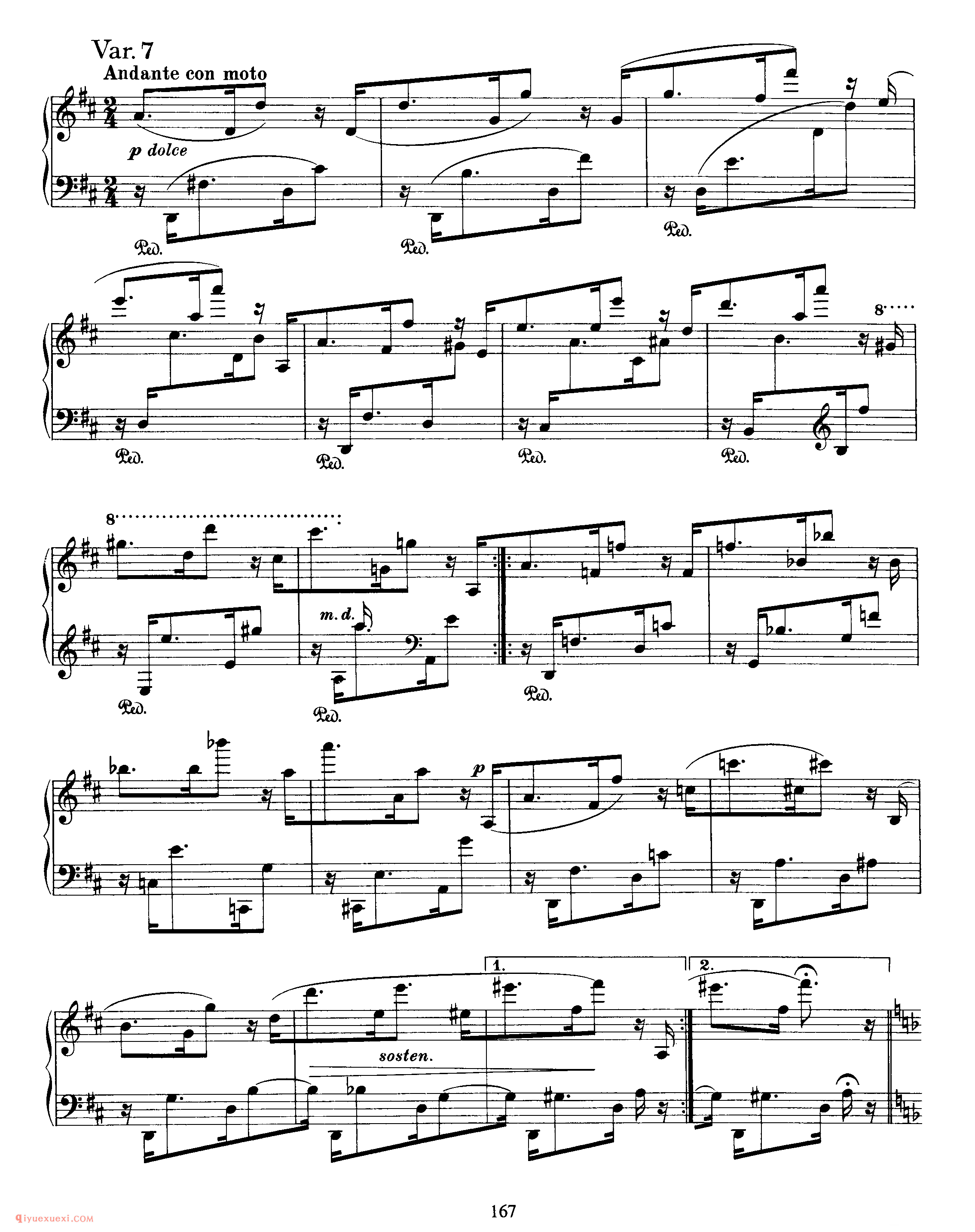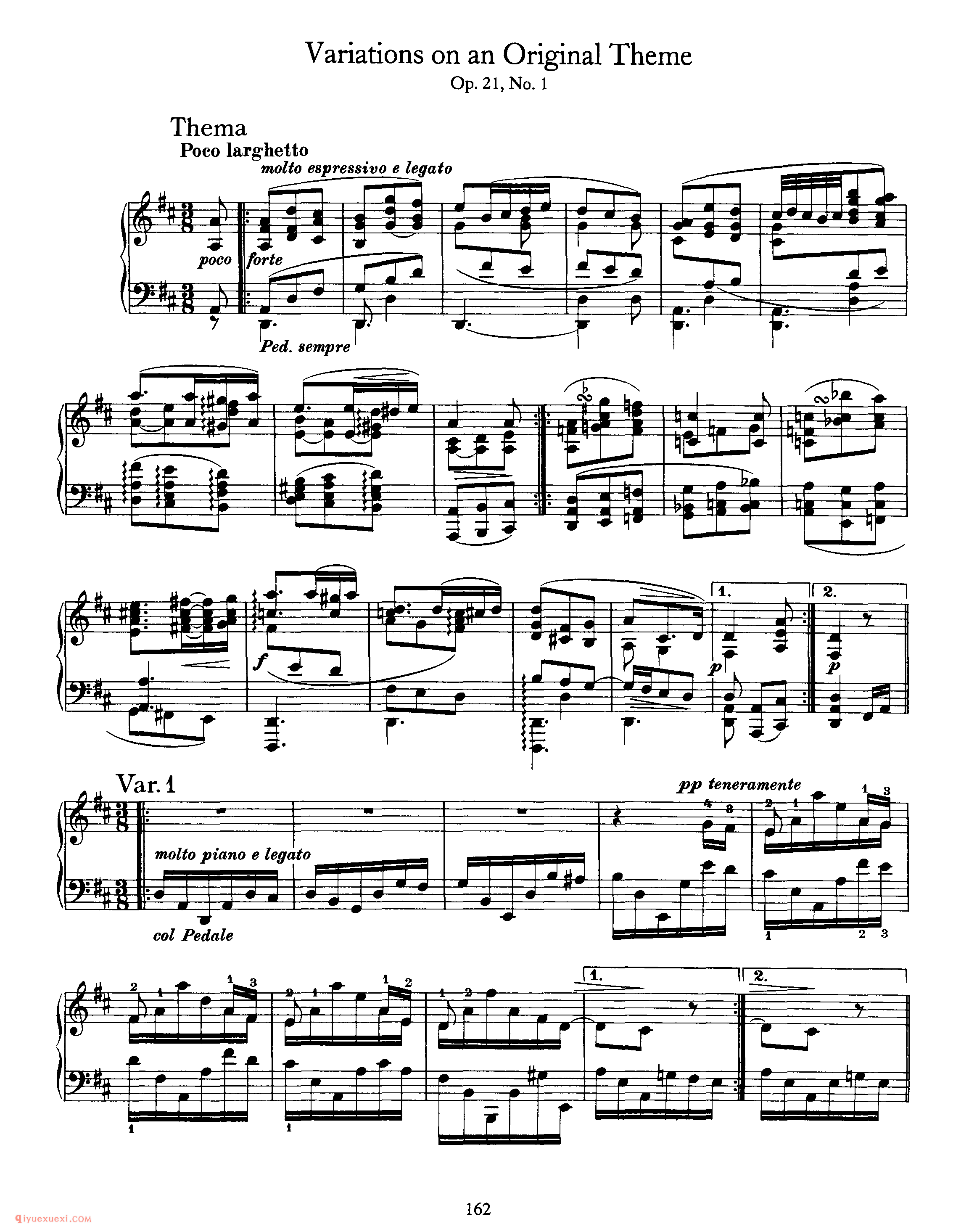 勃拉姆斯《D大调原创主题变奏曲》作品21第一首,1859年作于汉堡 ,是唯一由勃拉姆斯自创主题的变奏曲。当时,舒曼已去世三年,勃拉姆斯已向克拉拉表明了心意,却因为各自的理由没有结合,之后也遇到过准备要订婚的女子,却始终没有坚持到最后,自此之后,勃拉姆斯的性格更加矜持,从而致使他的作品也摒弃了浪漫主义时期的潇洒、自由,回归到了古典时期的均衡、规整。