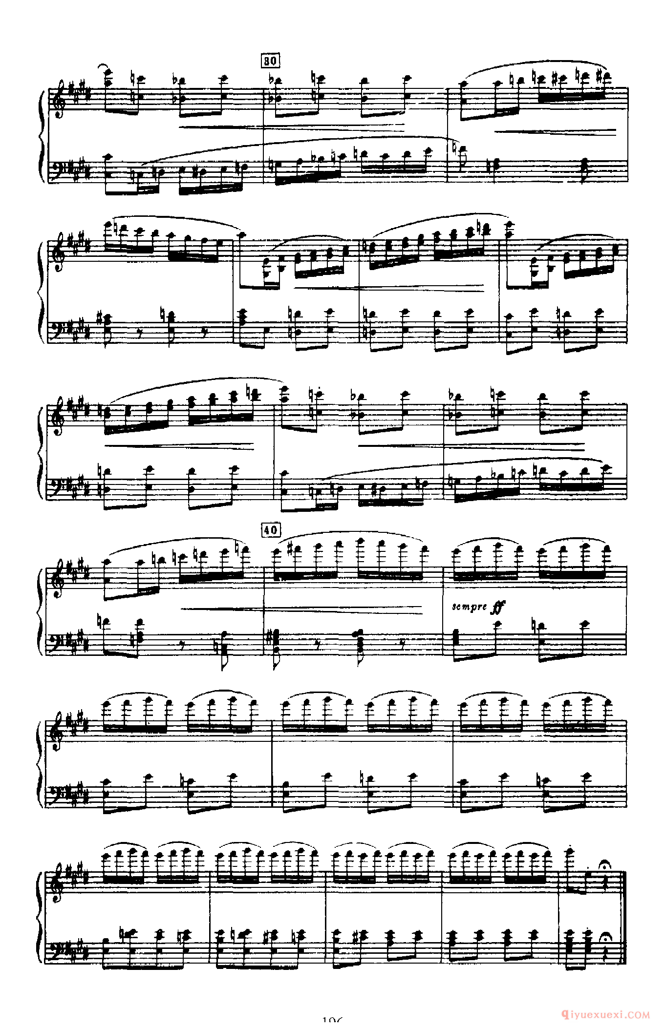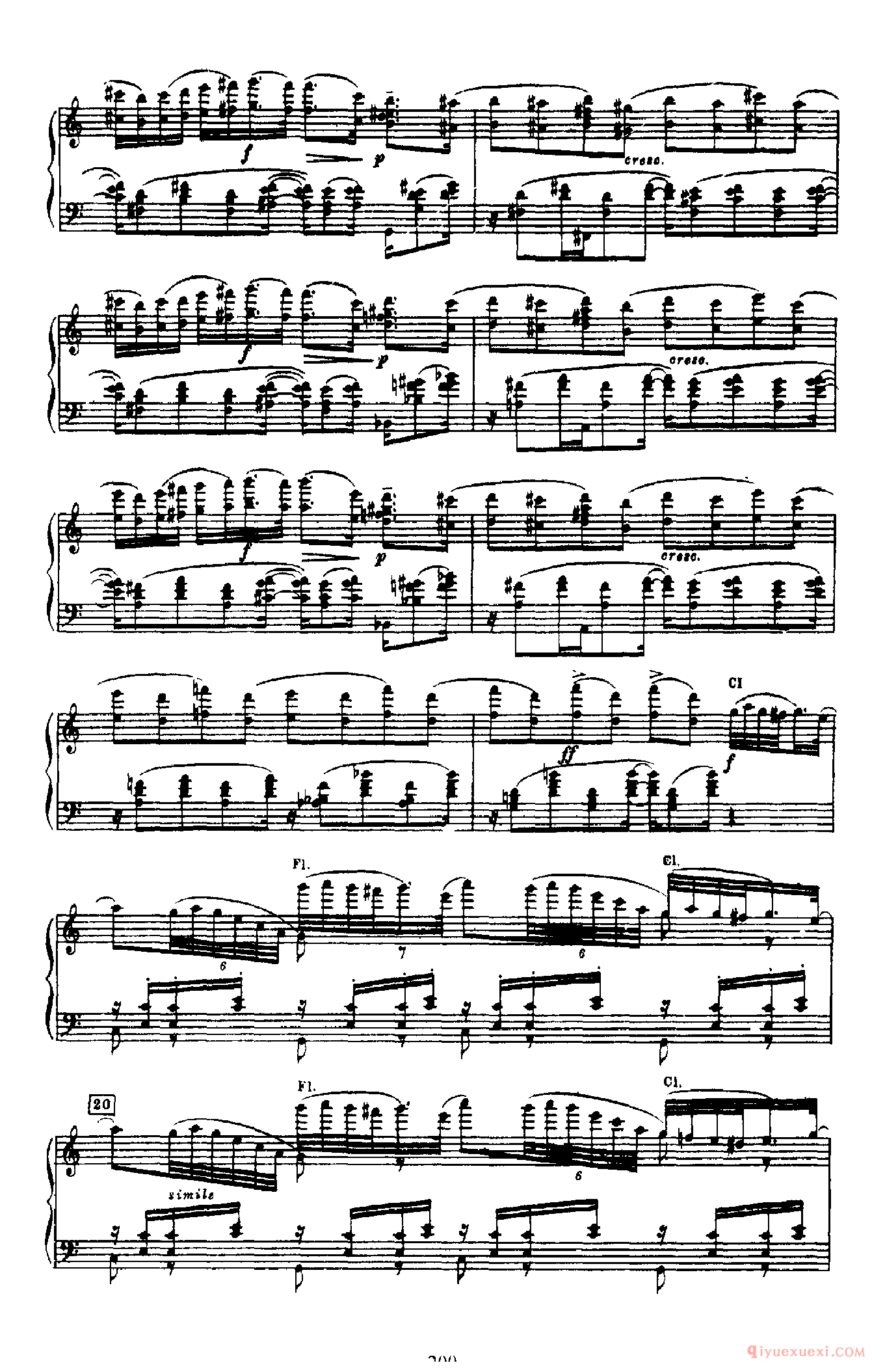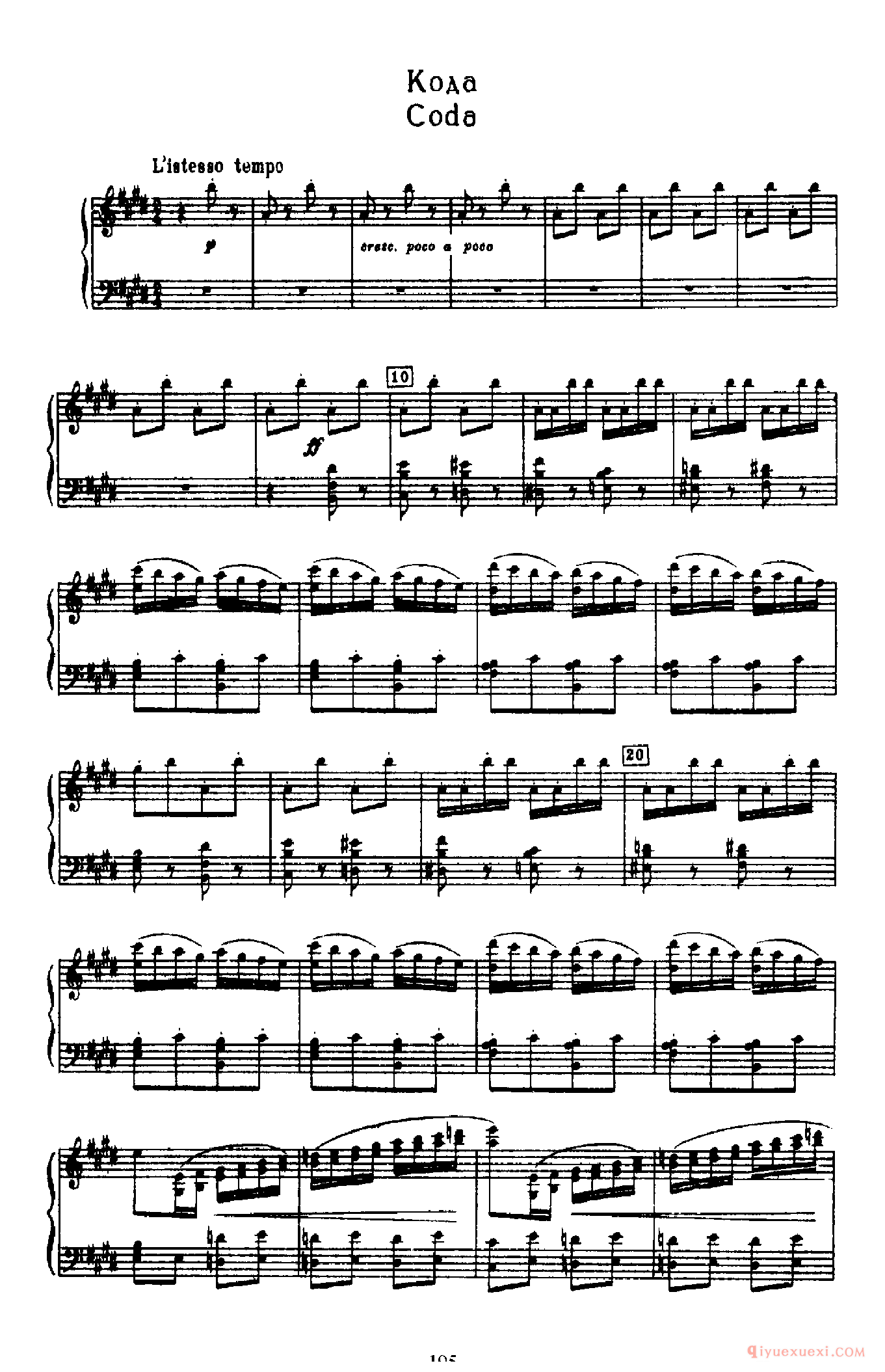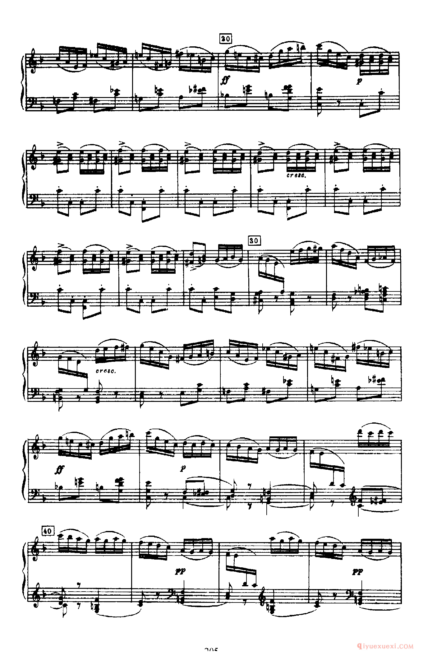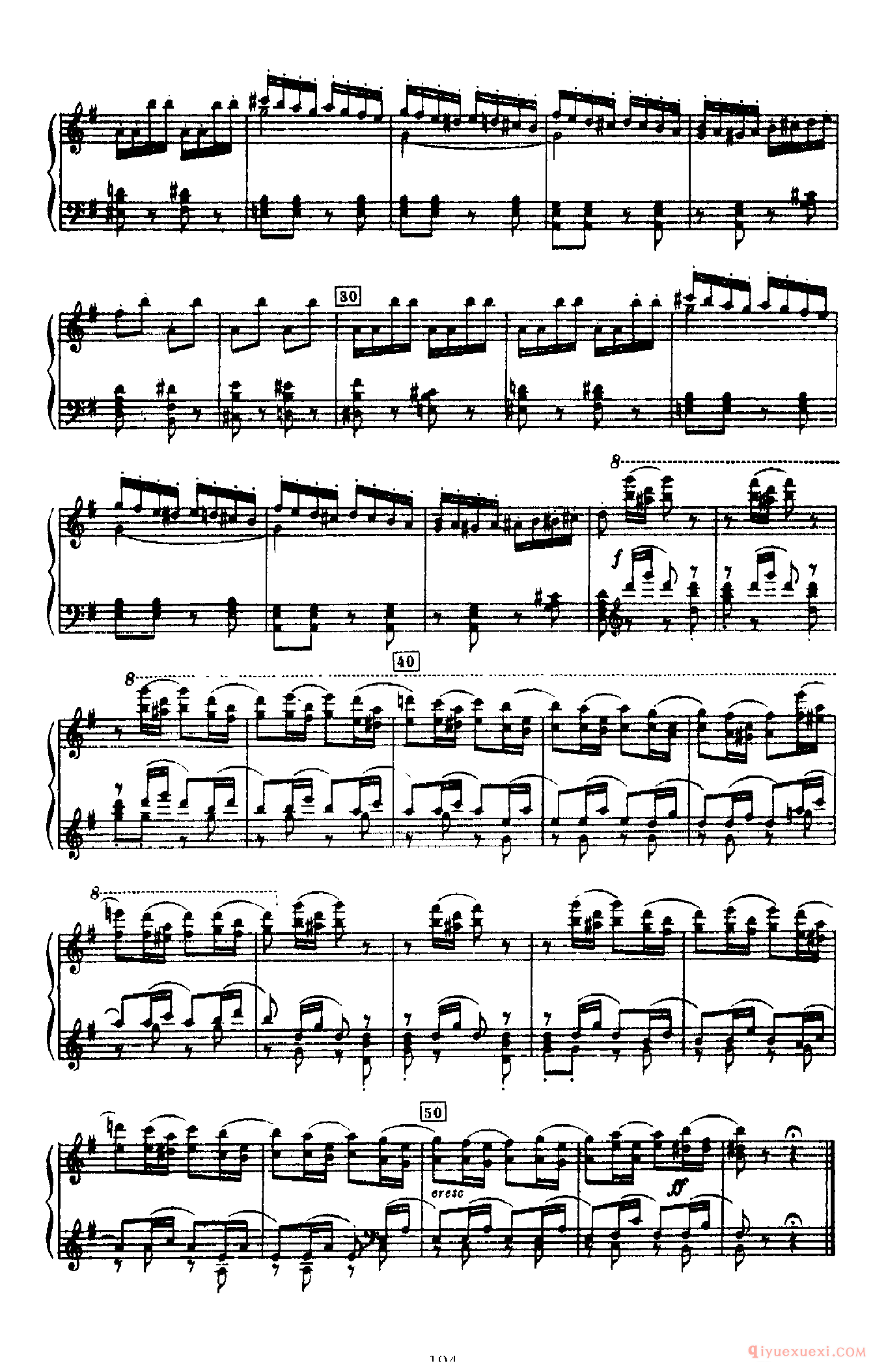 技巧: 1.这首作品和前面第八条的训练内容是一样的,都是音阶型的跑动练习,所不同的是这条练习曲以左手训练为主,左手需要注意的技巧要点和右手一样,仍然是换指动作的准确性。(具...