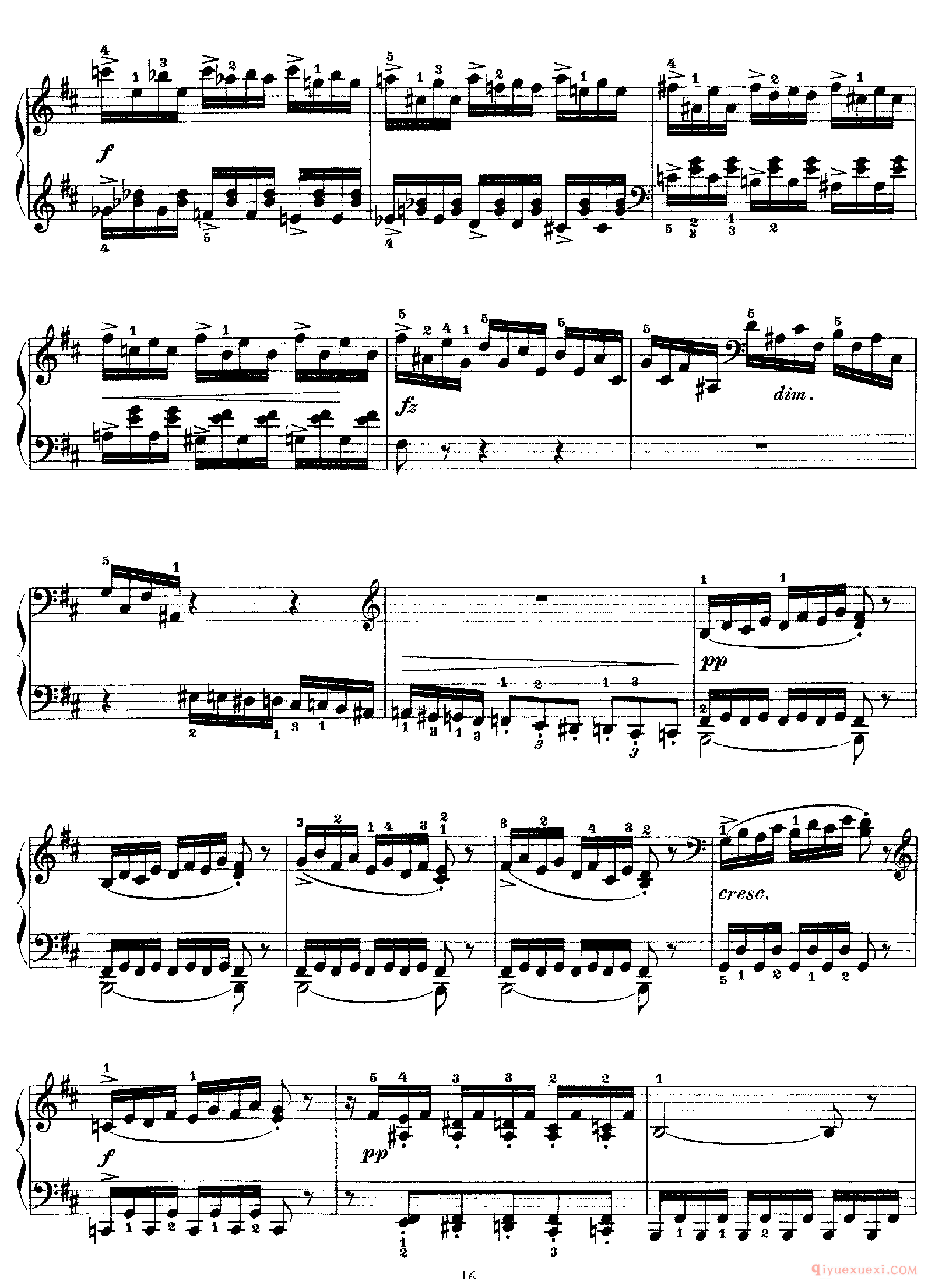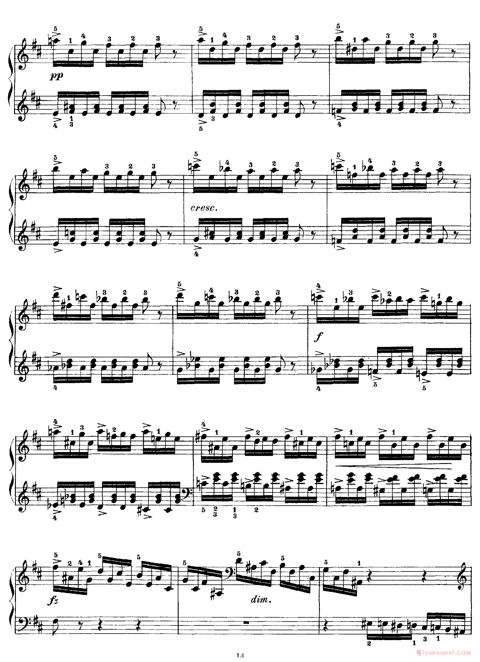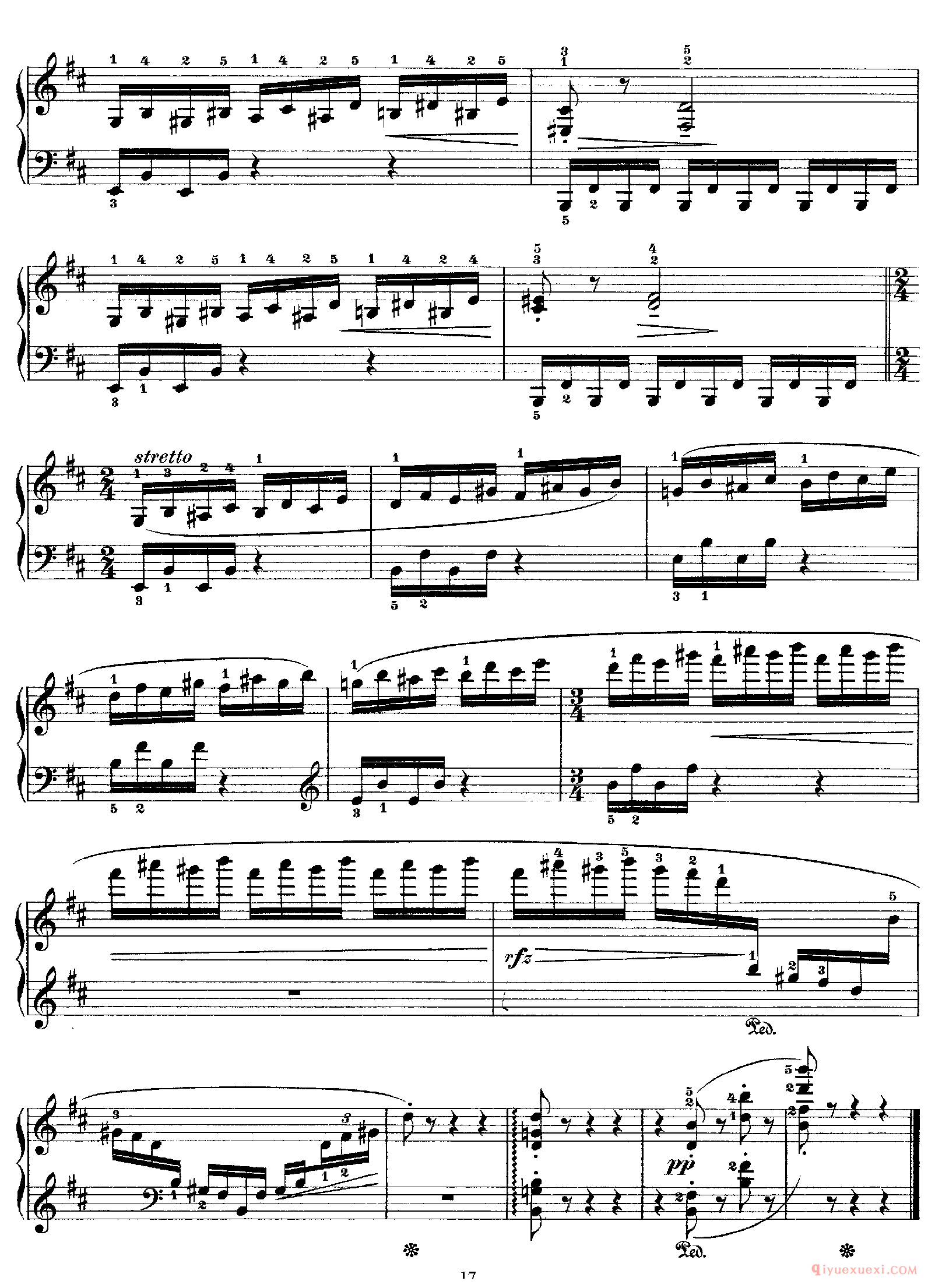 技巧: 1.这首作品和前面第八条的训练内容是一样的,都是音阶型的跑动练习,所不同的是这条练习曲以左手训练为主,左手需要注意的技巧要点和右手一样,仍然是换指动作的准确性。(具...