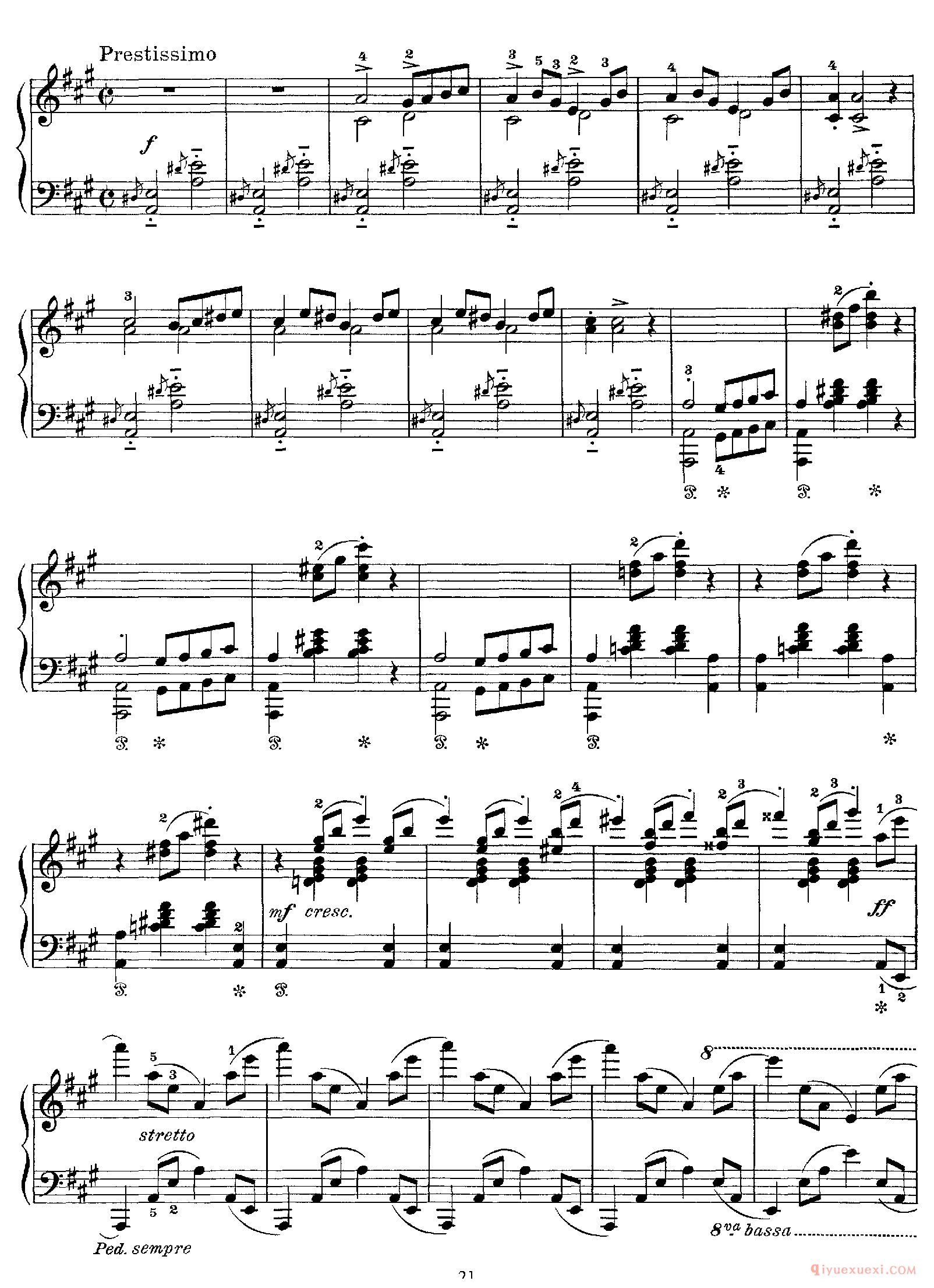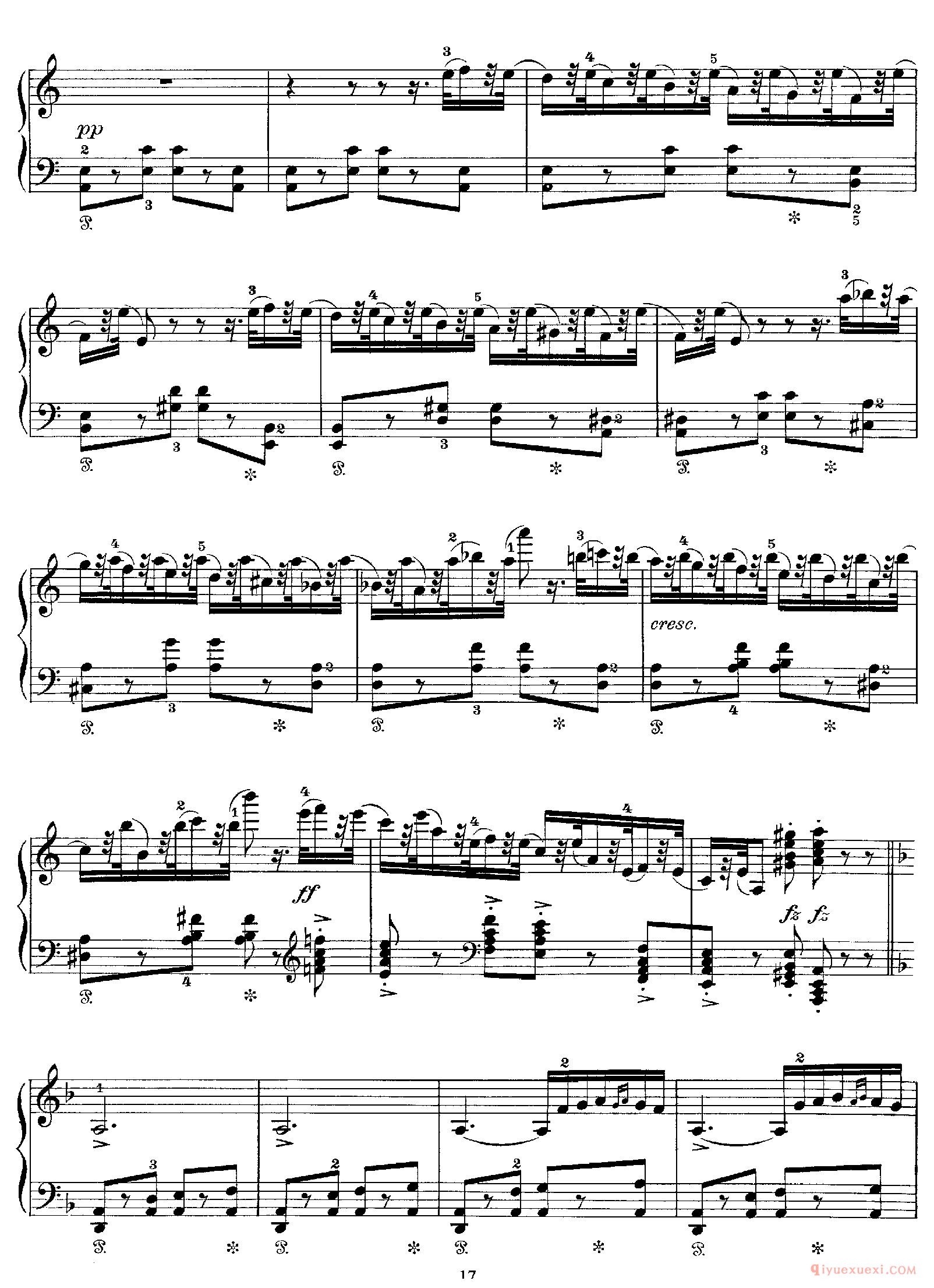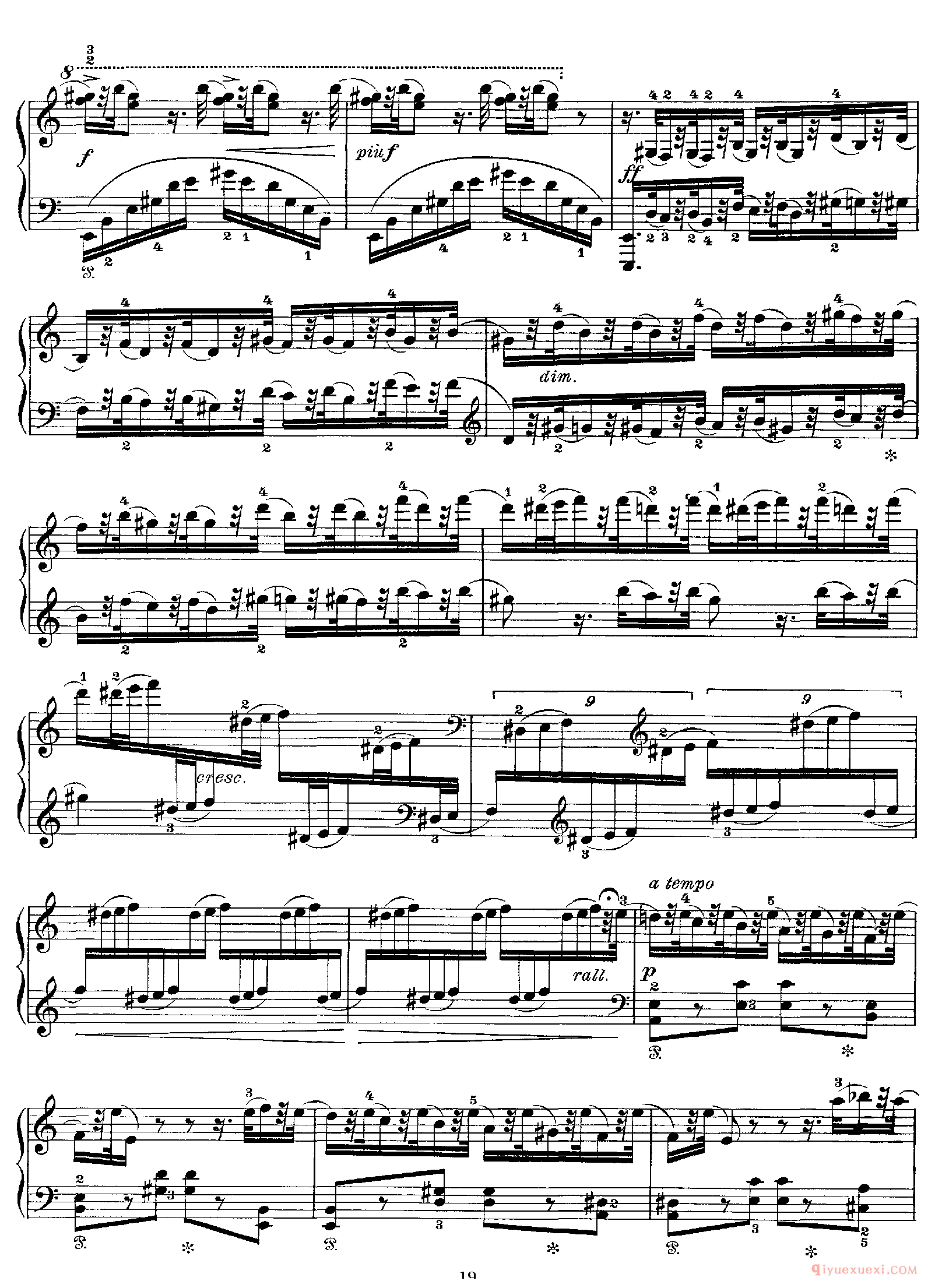 技巧: 1.这首作品和前面第八条的训练内容是一样的,都是音阶型的跑动练习,所不同的是这条练习曲以左手训练为主,左手需要注意的技巧要点和右手一样,仍然是换指动作的准确性。(具...