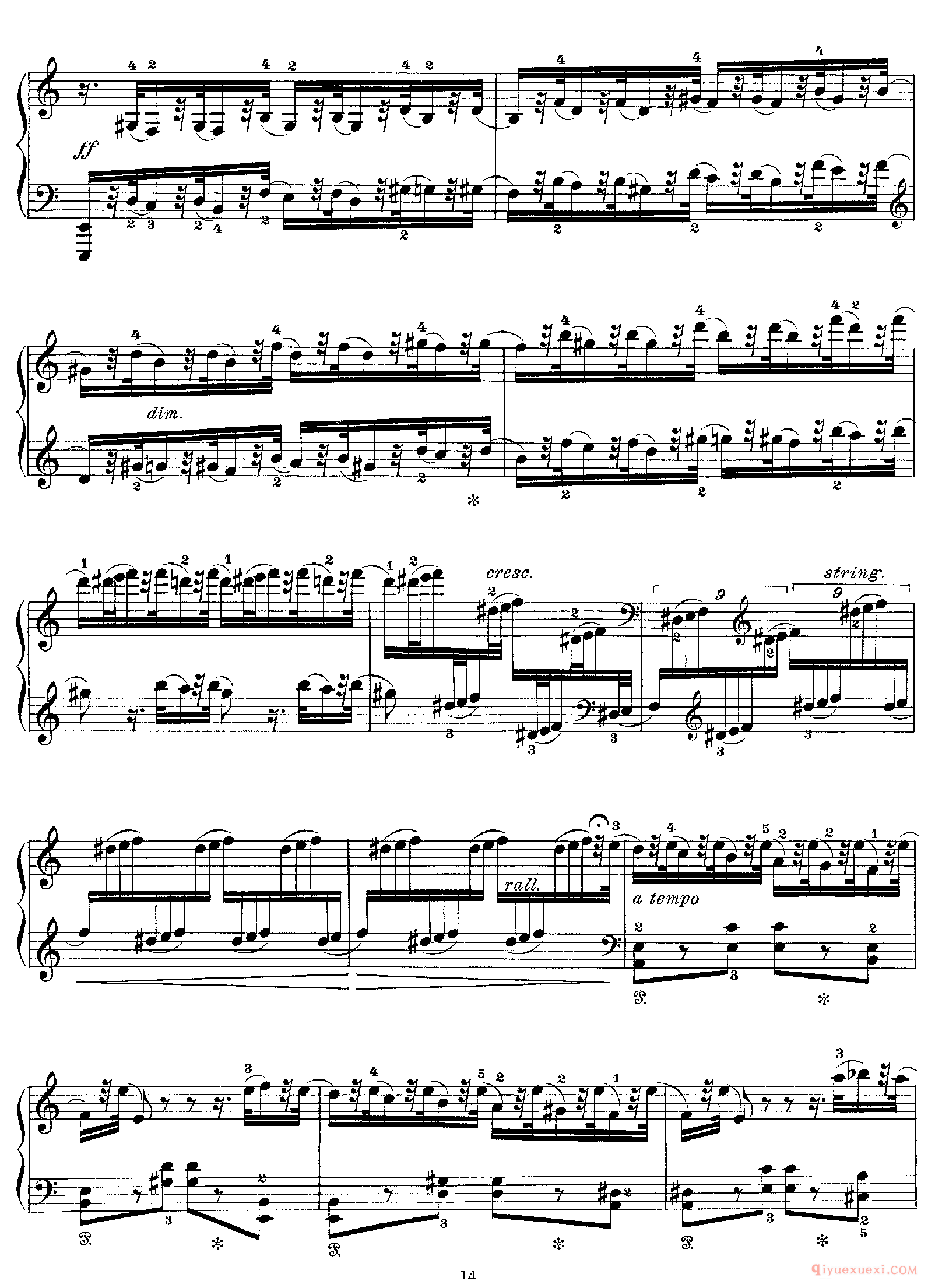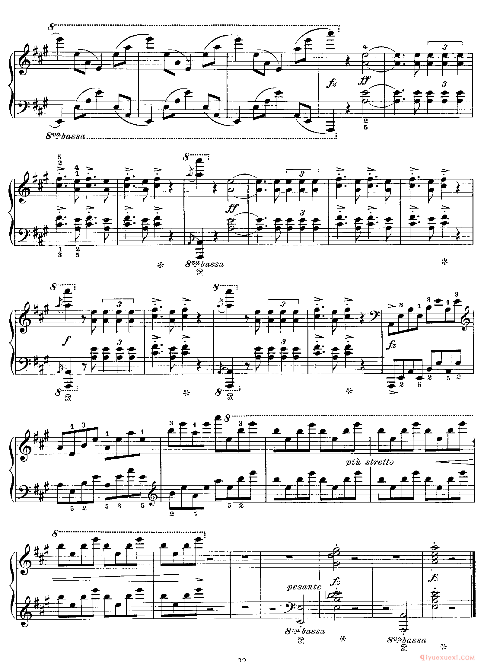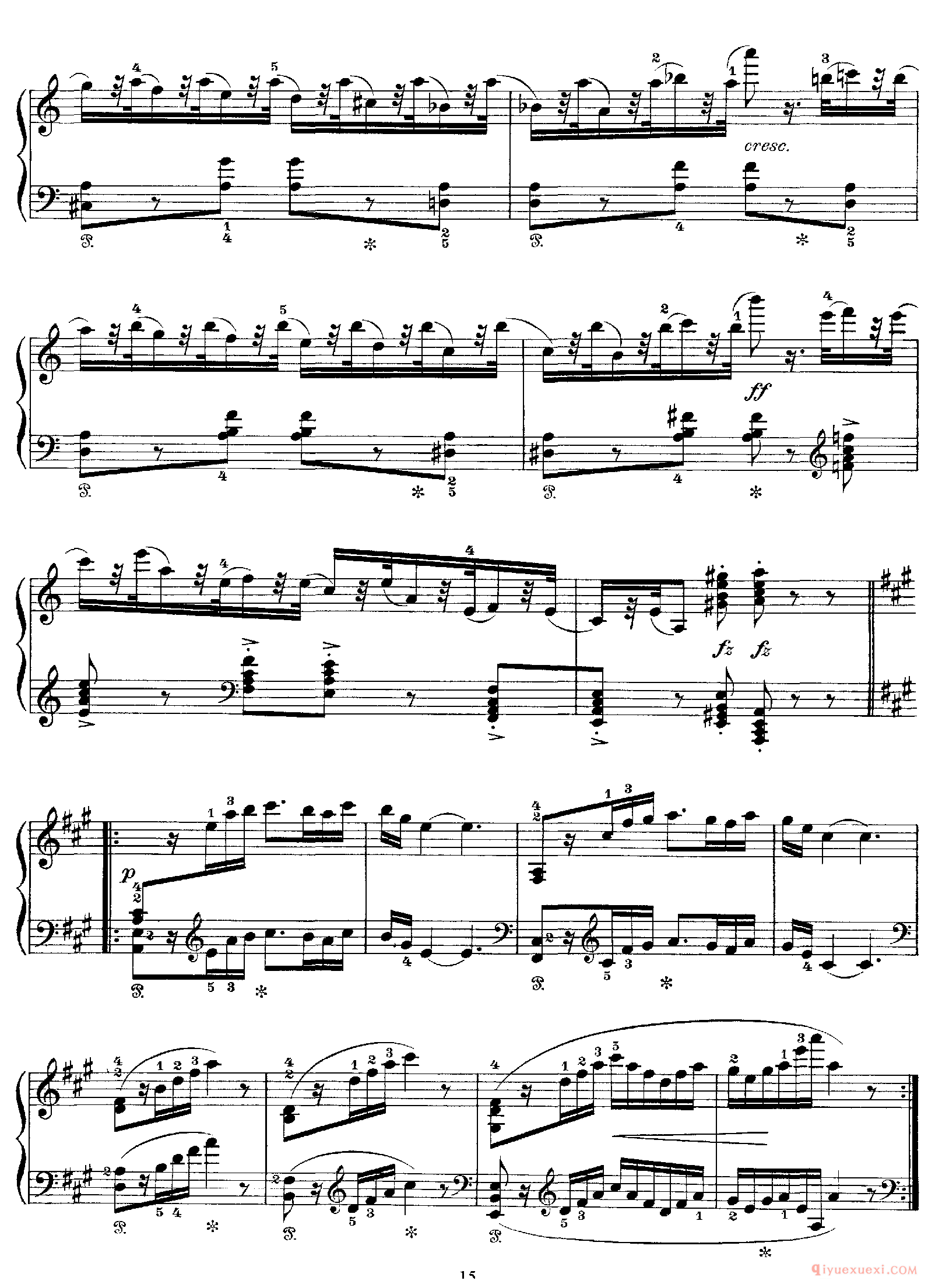 技巧: 1.这首作品和前面第八条的训练内容是一样的,都是音阶型的跑动练习,所不同的是这条练习曲以左手训练为主,左手需要注意的技巧要点和右手一样,仍然是换指动作的准确性。(具...