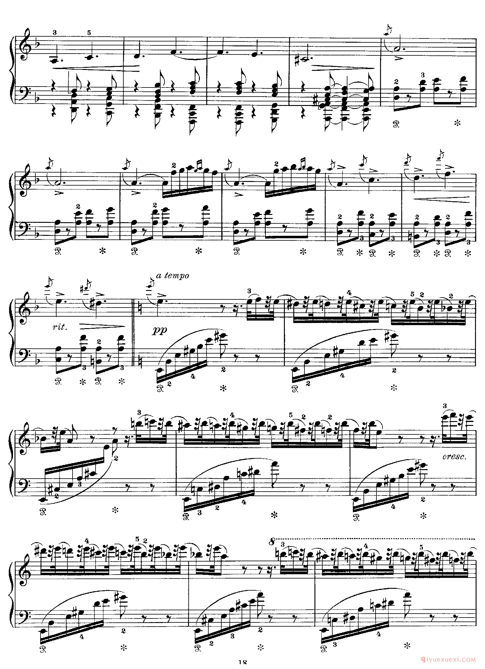 这首乐曲的左手弹奏时,小指既要站稳、保持,大指和三指又可略带轻微地带动手掌的翻动动作, 值得注意的是,19世纪的装饰音往往是在强拍之前弹奏的。因此第11小节的装饰音可从前一小节...