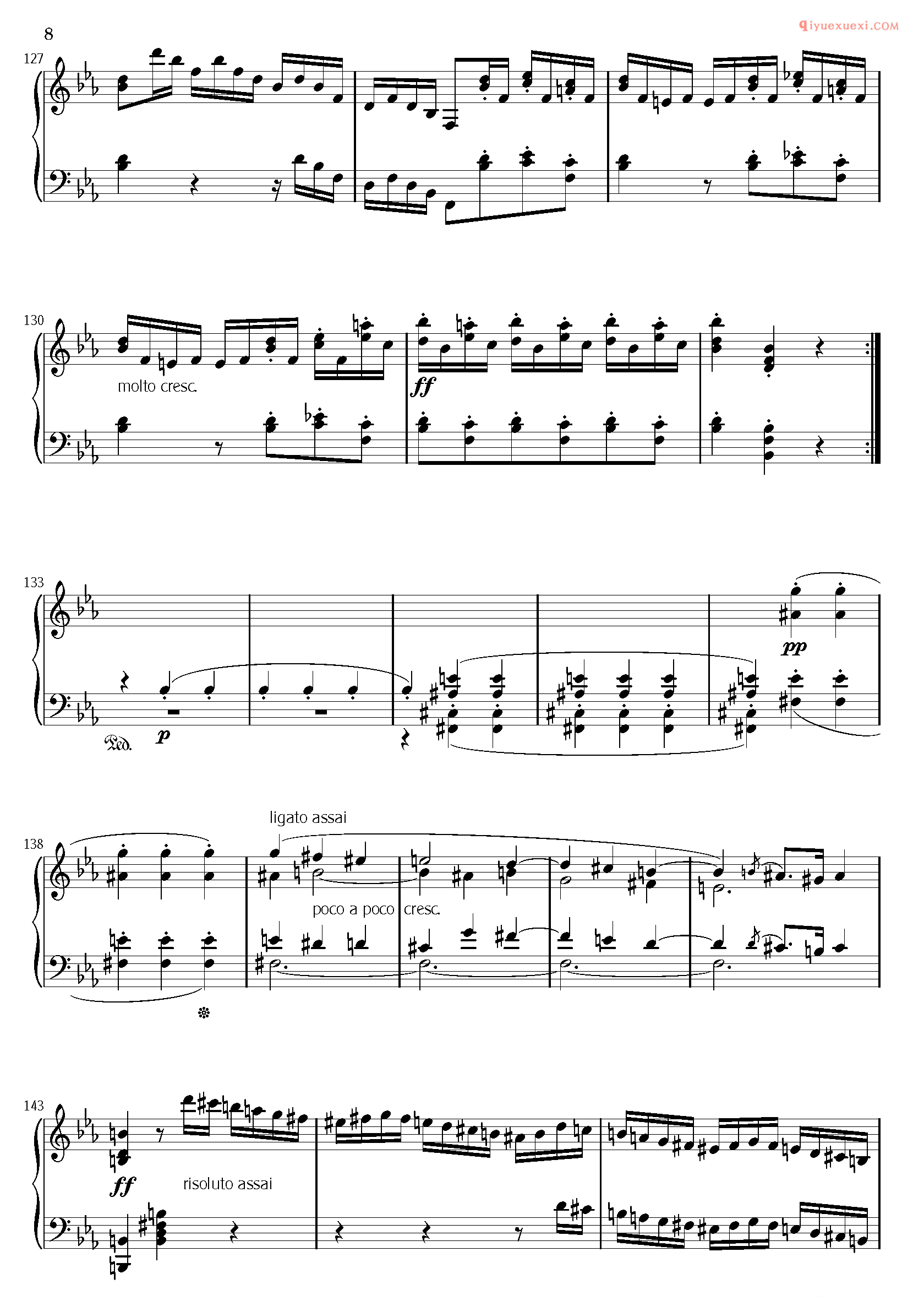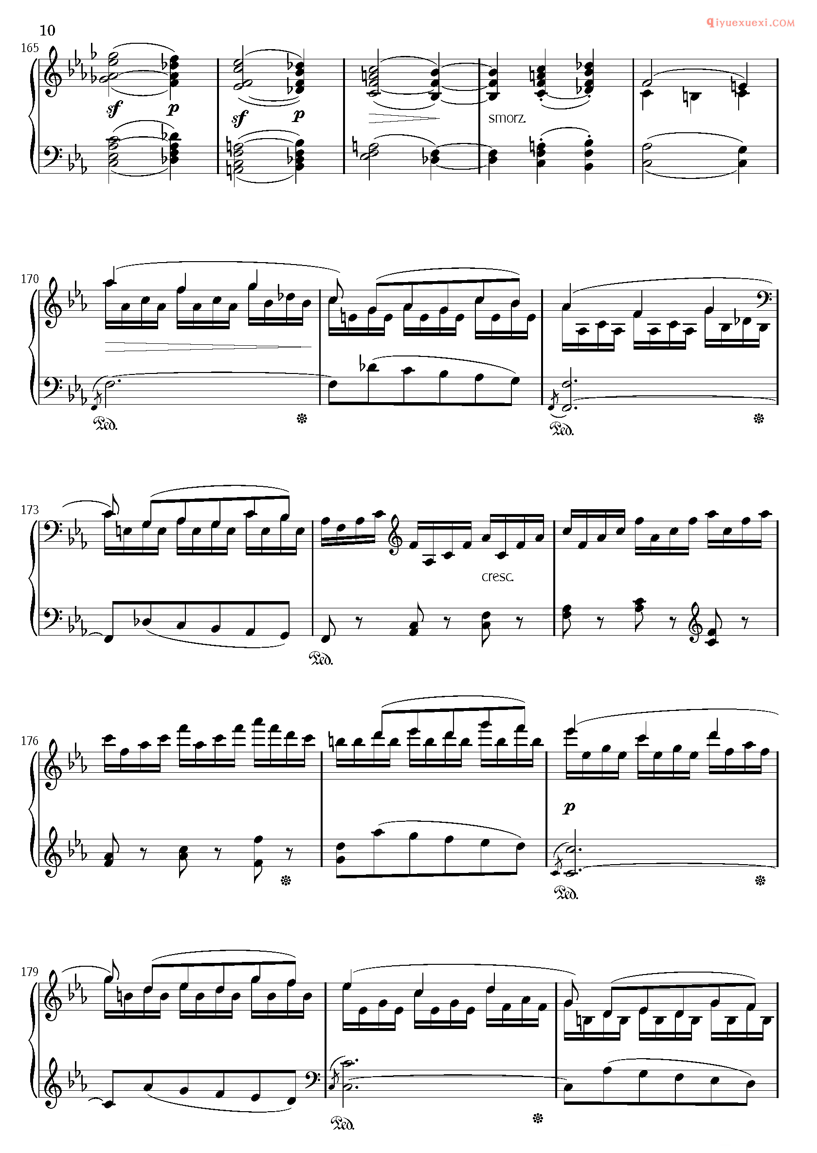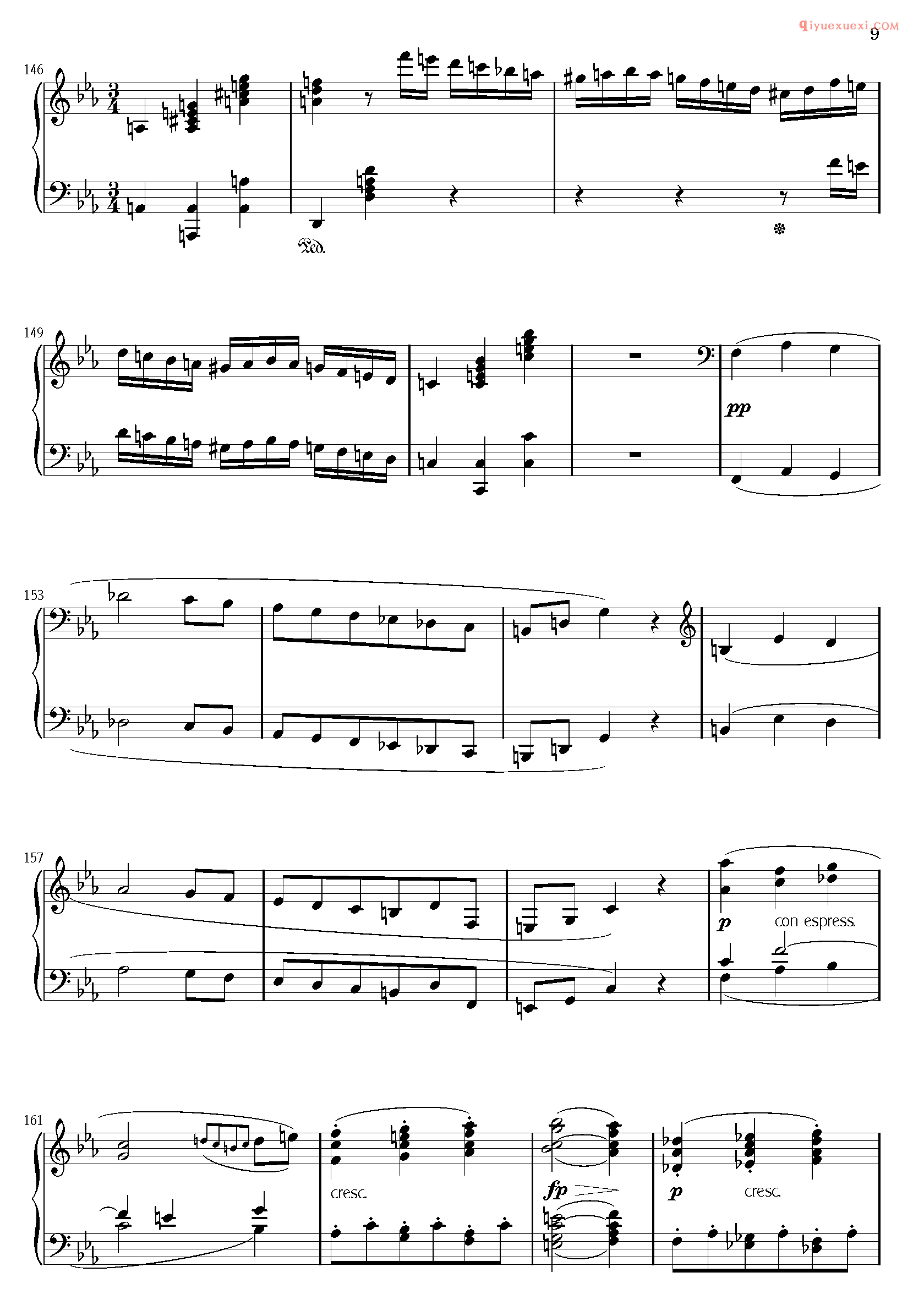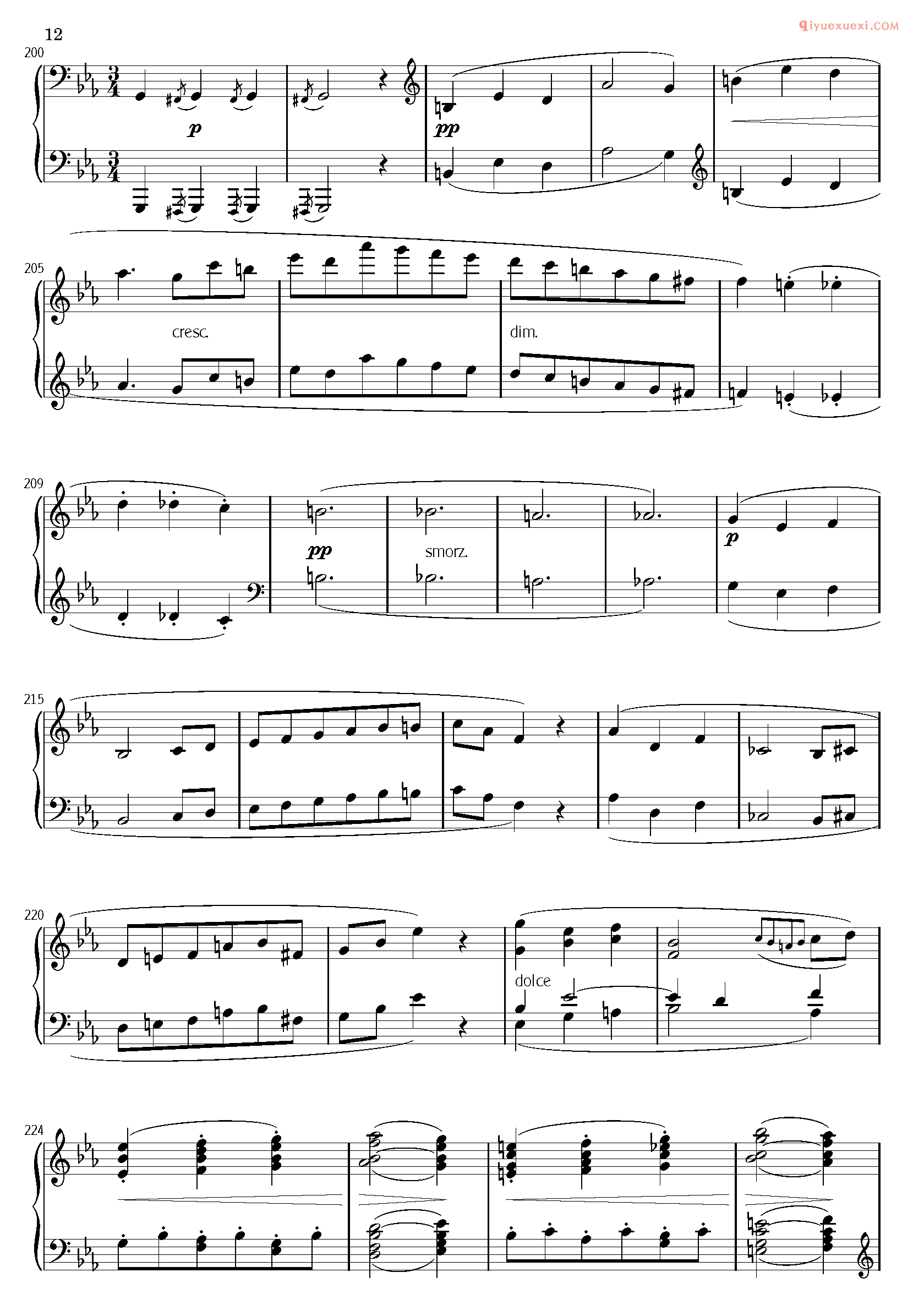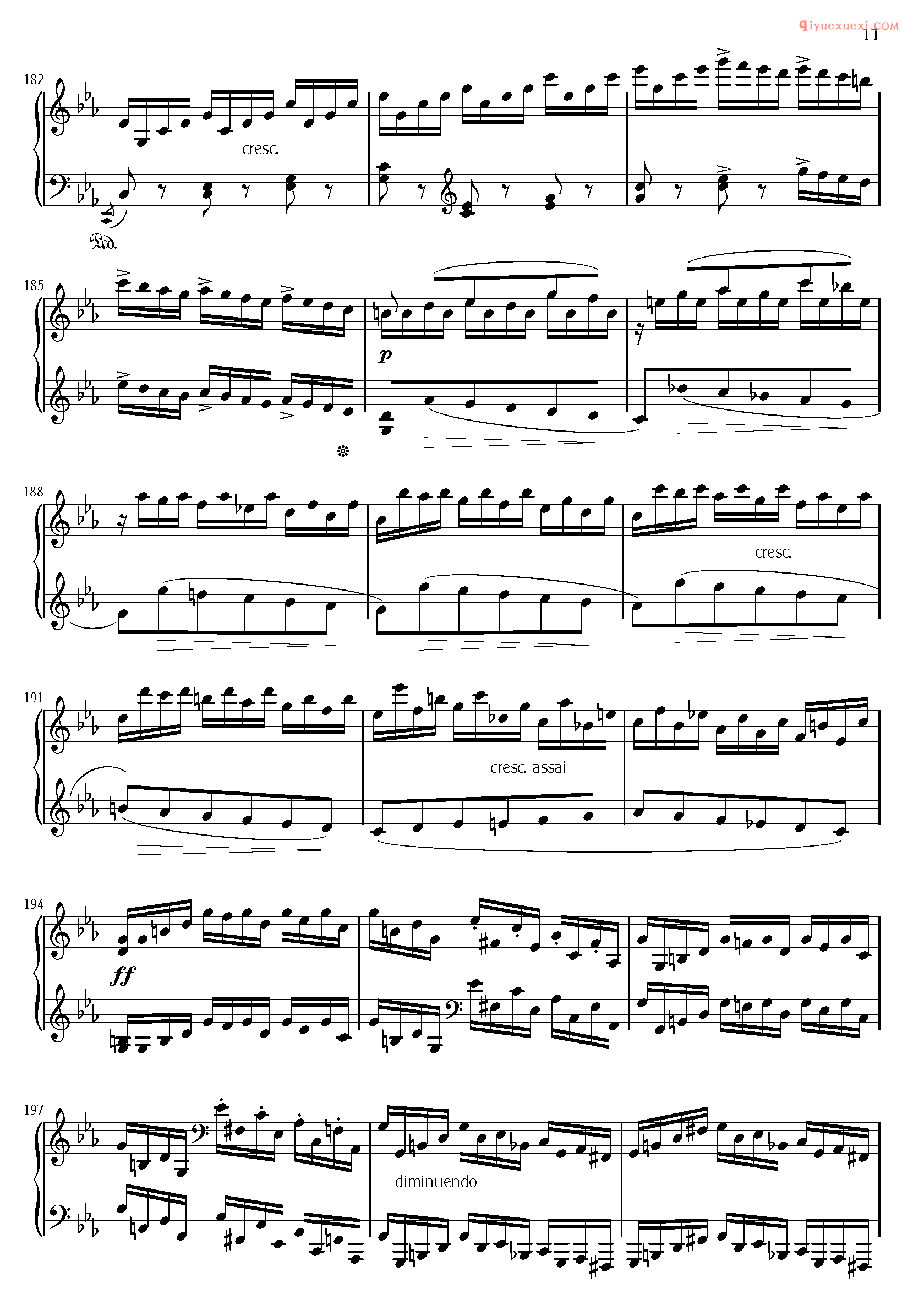 这首乐曲的左手弹奏时,小指既要站稳、保持,大指和三指又可略带轻微地带动手掌的翻动动作, 值得注意的是,19世纪的装饰音往往是在强拍之前弹奏的。因此第11小节的装饰音可从前一小节...