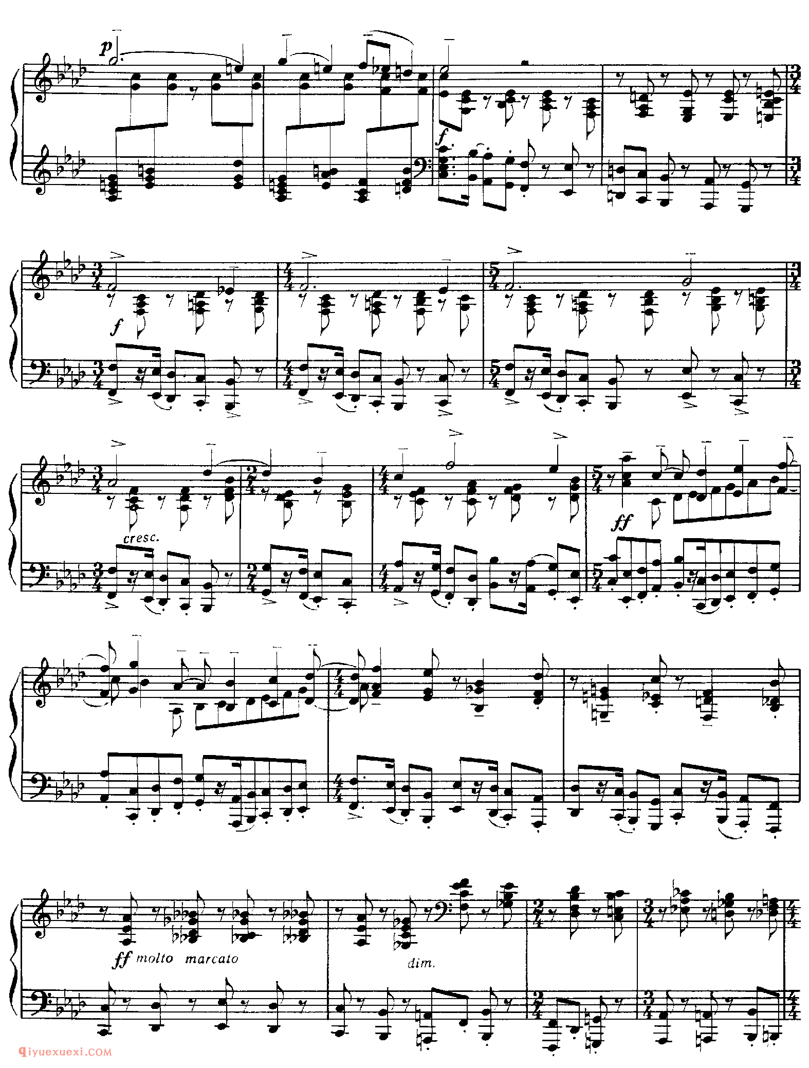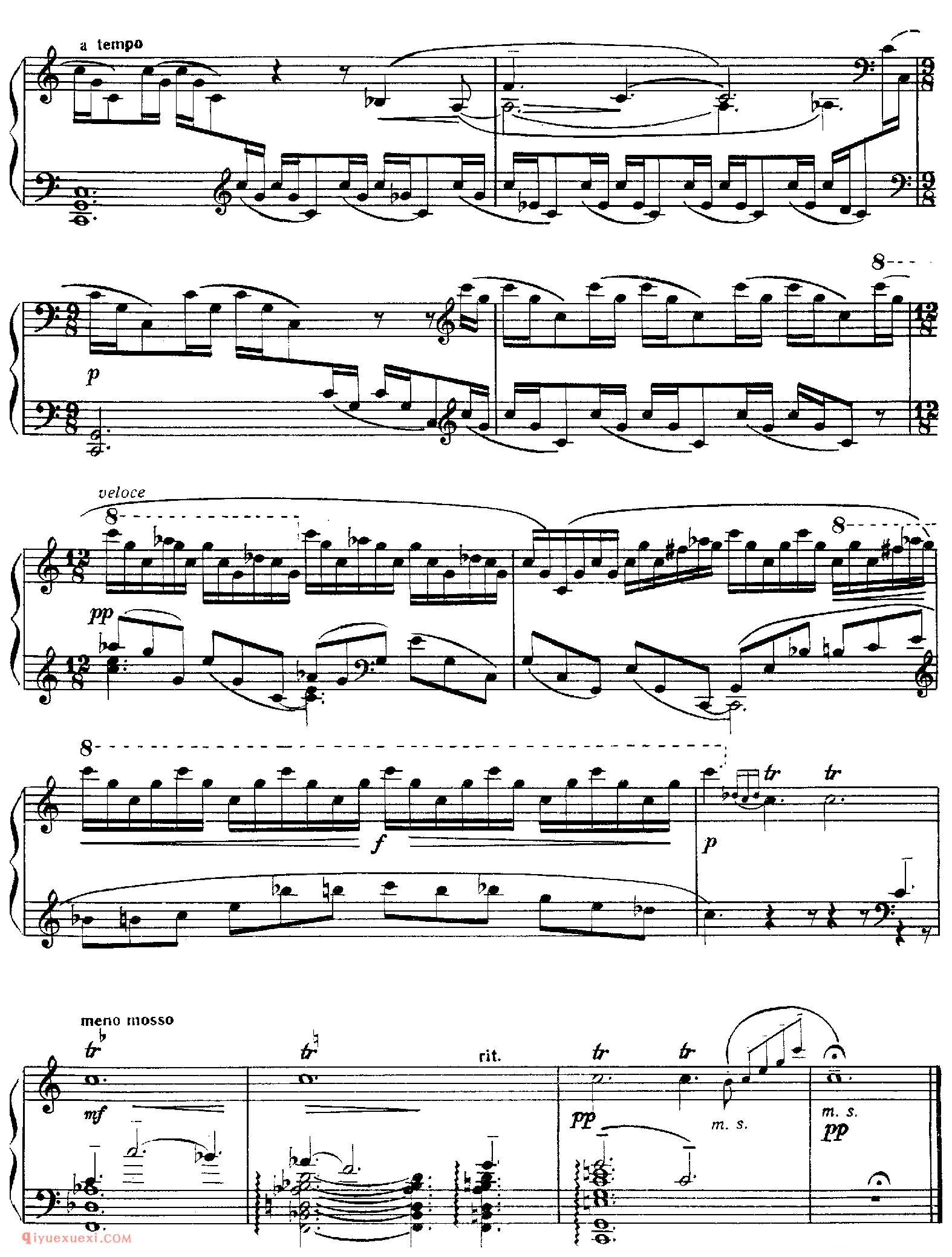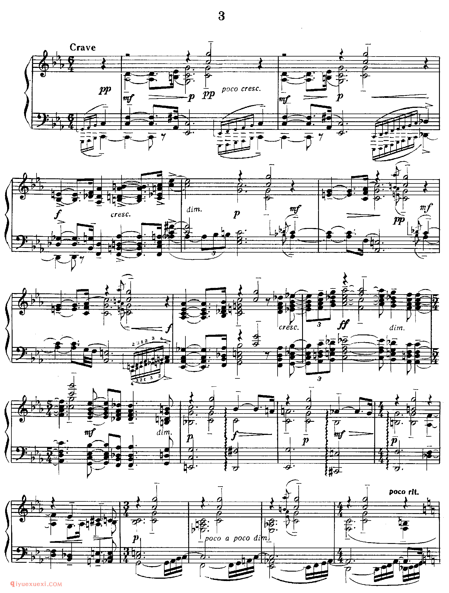 9.极缓板,升C小调,其中有3种对比性因素:进行曲风格的节奏、远处钟声般的音响及不安的动态。