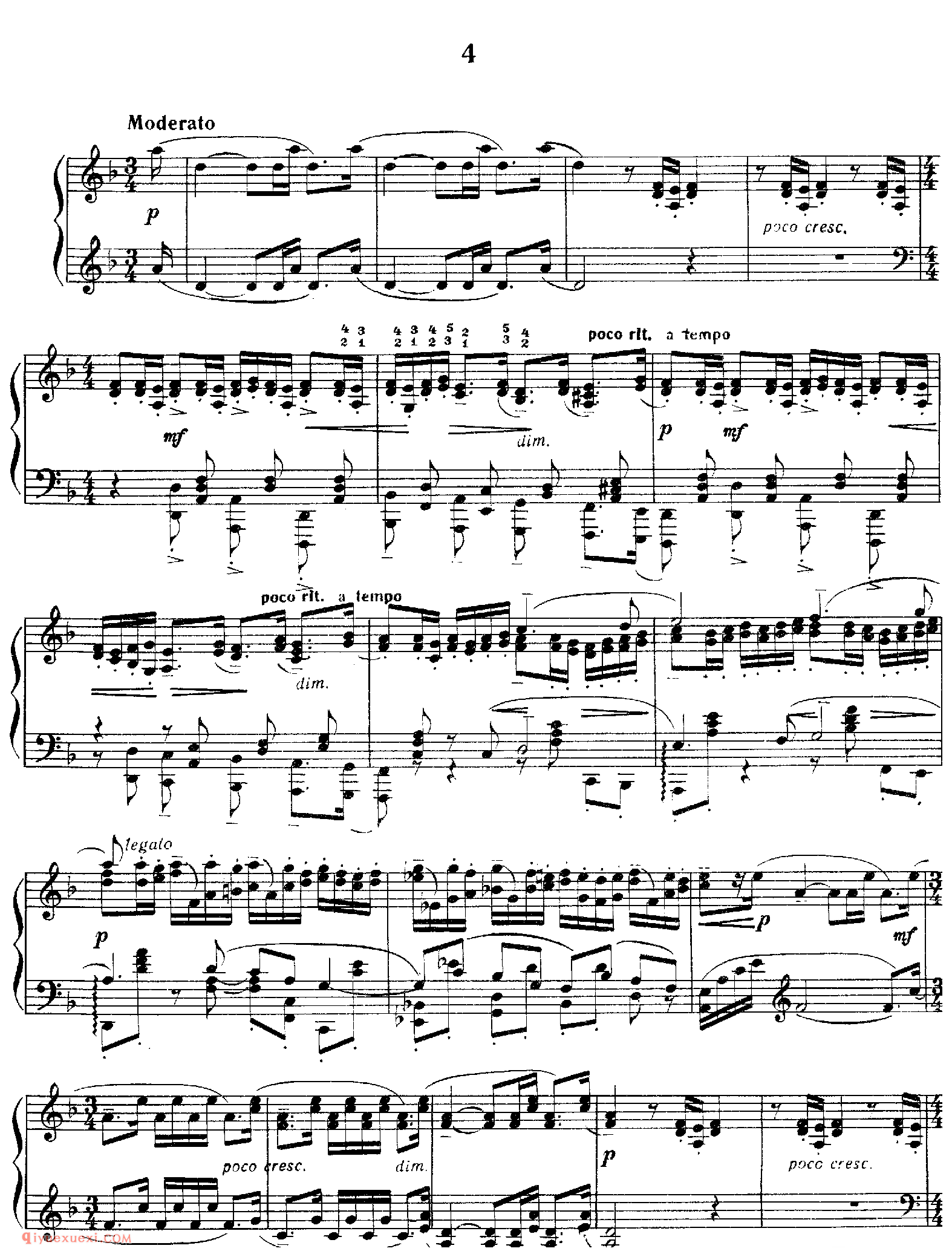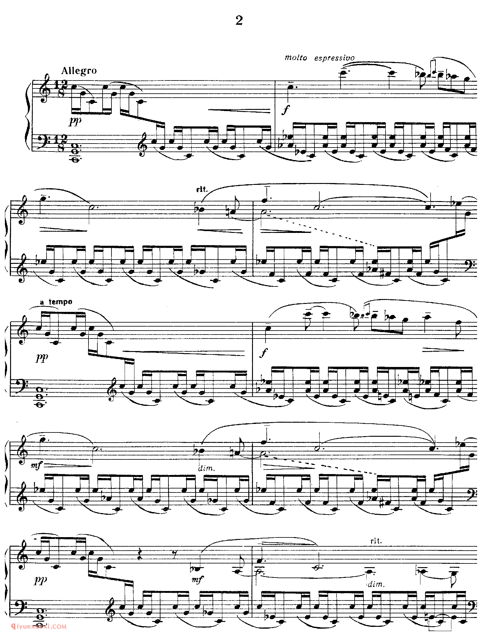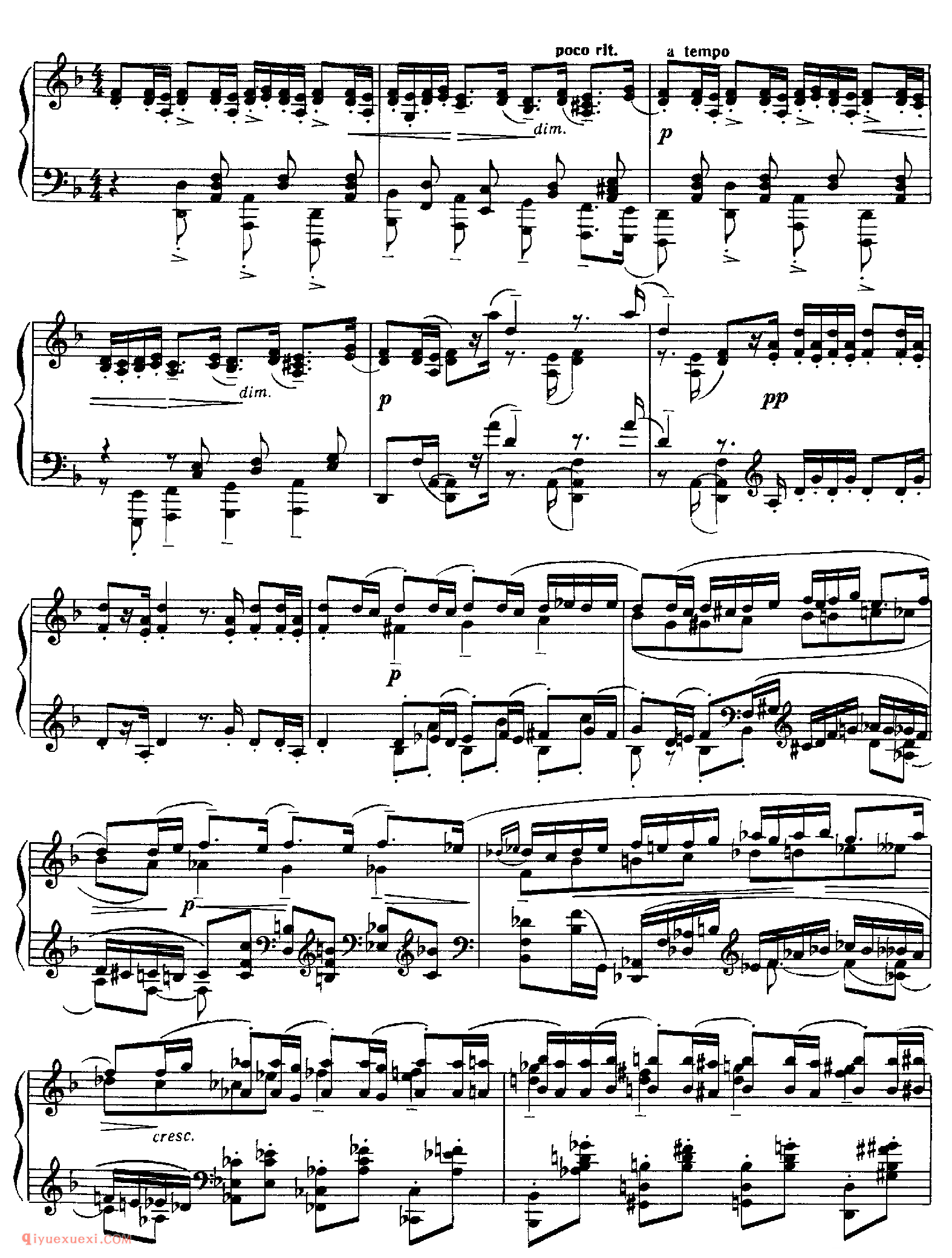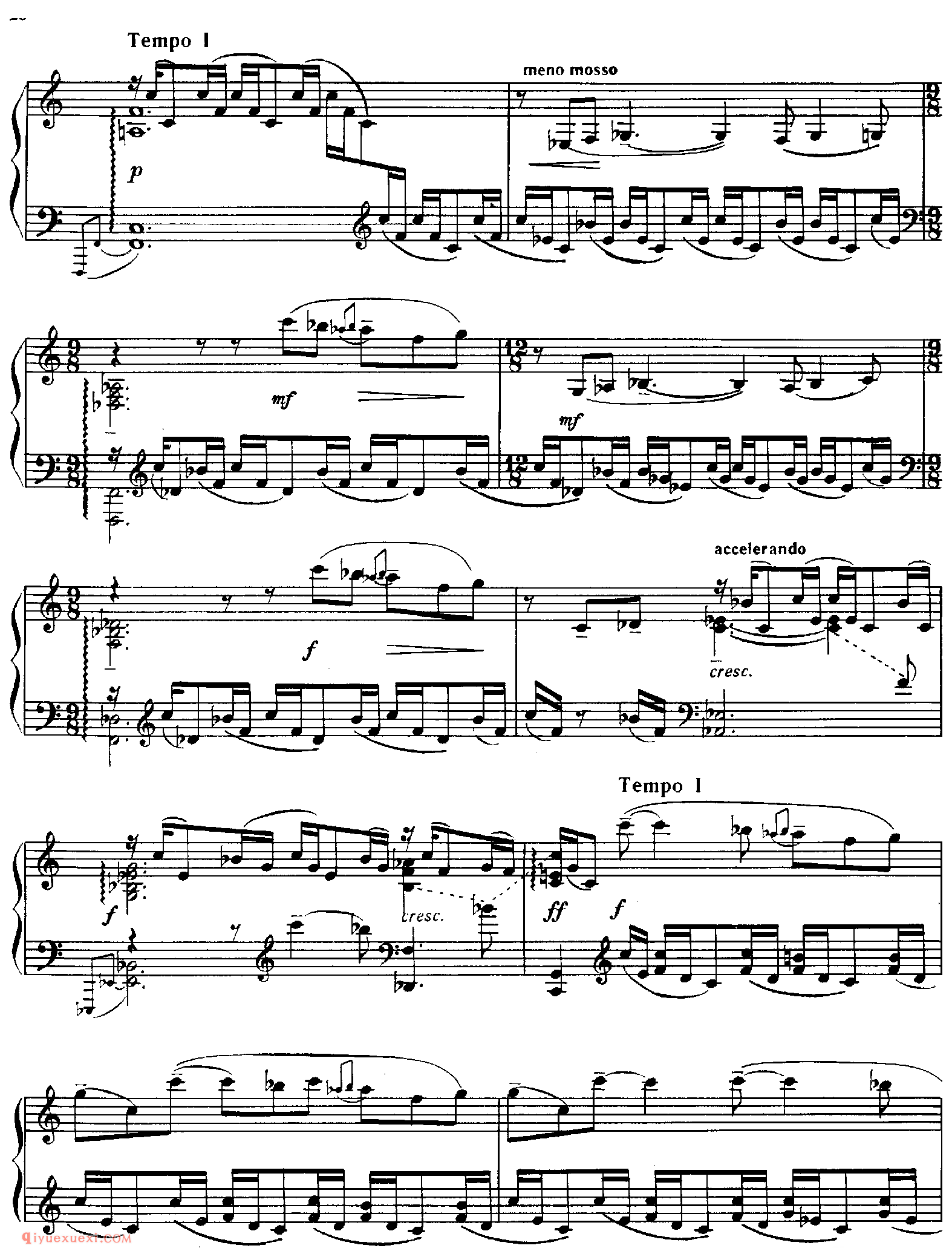 1.从容的快板,F小调,在低音域下行音阶有不安的音型,虽中间高音部有短暂独白,但很快就被阻断,顽固音型复现于低音,最后远处有钟声表现。