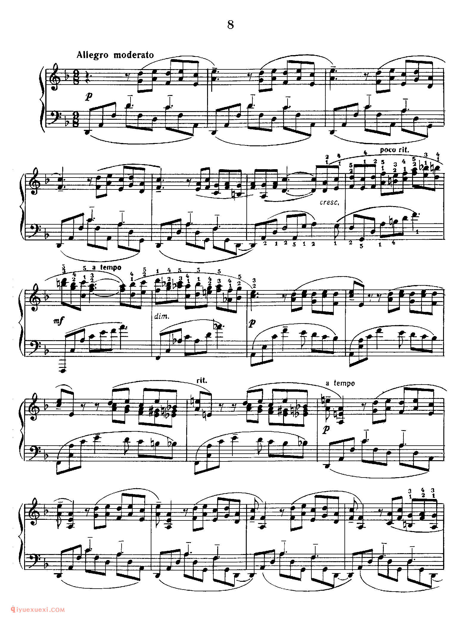 这首乐曲的左手弹奏时,小指既要站稳、保持,大指和三指又可略带轻微地带动手掌的翻动动作, 值得注意的是,19世纪的装饰音往往是在强拍之前弹奏的。因此第11小节的装饰音可从前一小节...