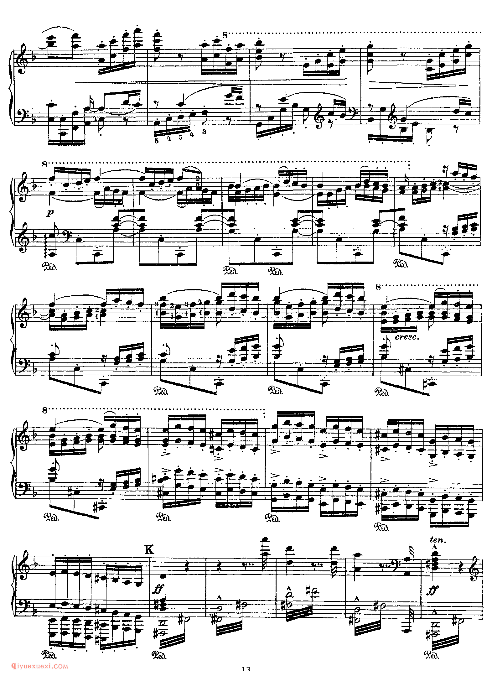 技巧: 1.这首作品和前面第八条的训练内容是一样的,都是音阶型的跑动练习,所不同的是这条练习曲以左手训练为主,左手需要注意的技巧要点和右手一样,仍然是换指动作的准确性。(具...