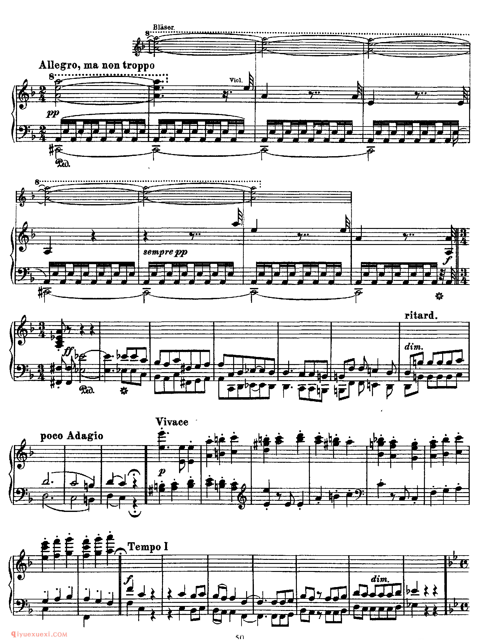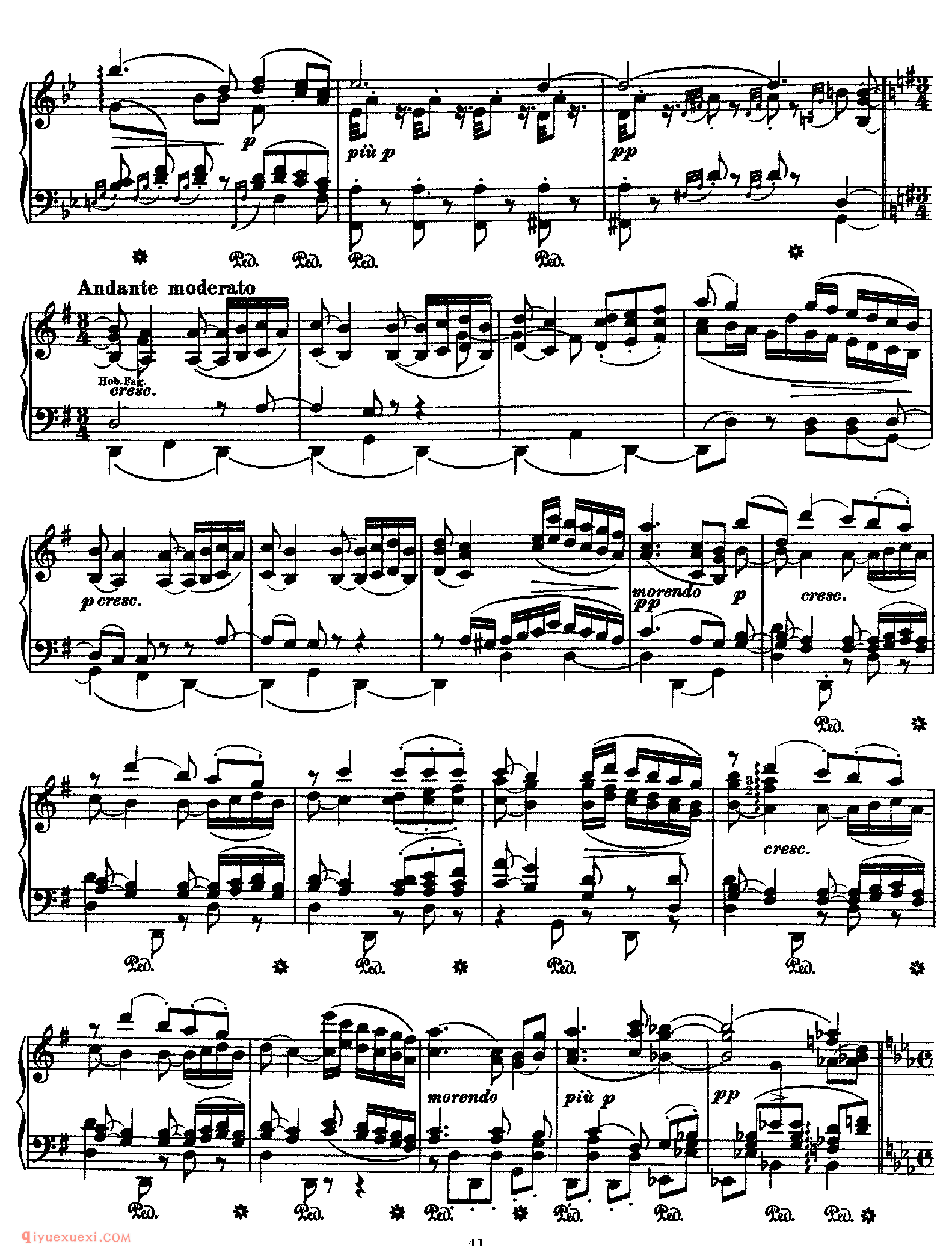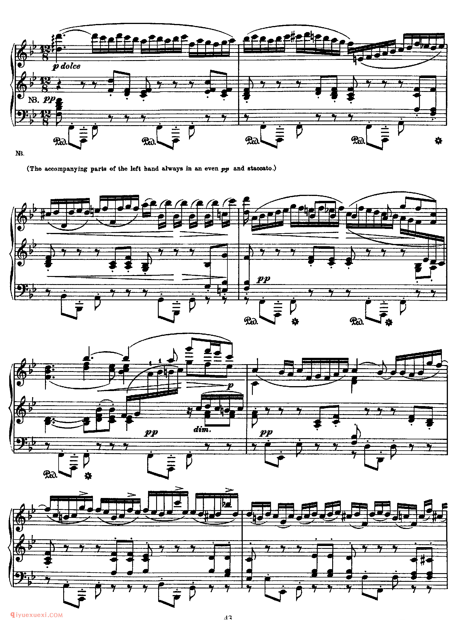 这首乐曲的左手弹奏时,小指既要站稳、保持,大指和三指又可略带轻微地带动手掌的翻动动作, 值得注意的是,19世纪的装饰音往往是在强拍之前弹奏的。因此第11小节的装饰音可从前一小节...