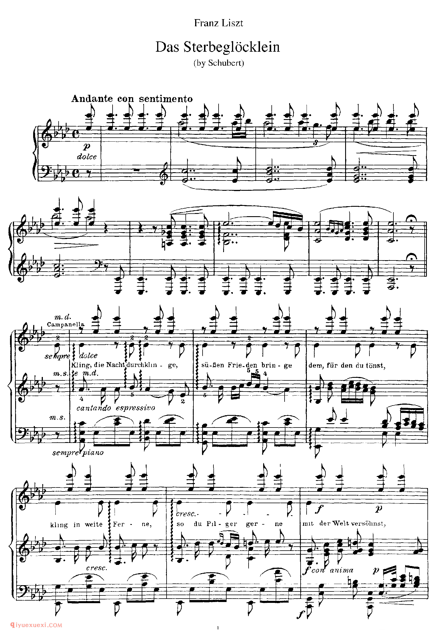 Das Sterbeglocklein (Schubert)_改编舒伯特_李斯特钢琴乐谱高清电子版乐谱歌词图片是器乐学习网于2021年11月27日 17:31:11更新分享的钢琴曲谱;资源收录于钢琴曲谱栏目中;器乐学习网免费分享Das Sterbeglocklein (Schubert)_改编舒伯特_李斯特钢琴乐谱简谱与五线谱歌谱图片,欢迎在线免费下载;器乐学习网无需注册会员,直接免费下载各类乐器学习资源及乐谱。