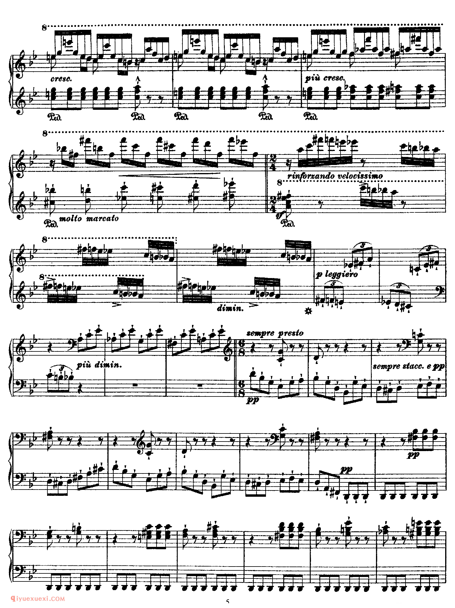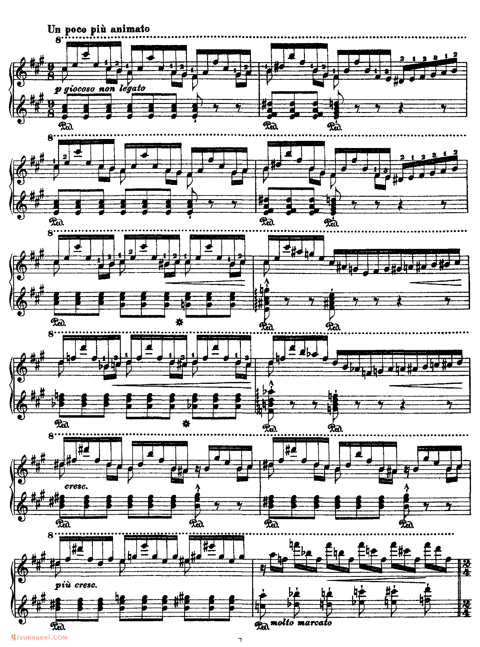 升f小调,谐谑的急板。频繁变化的调性和节奏是这首曲子的基本特点。作曲家用快速的顿音奏法描绘侏儒身材矮、腿脚短、步伐小而动作敏捷、跳跳蹦蹦的特点。