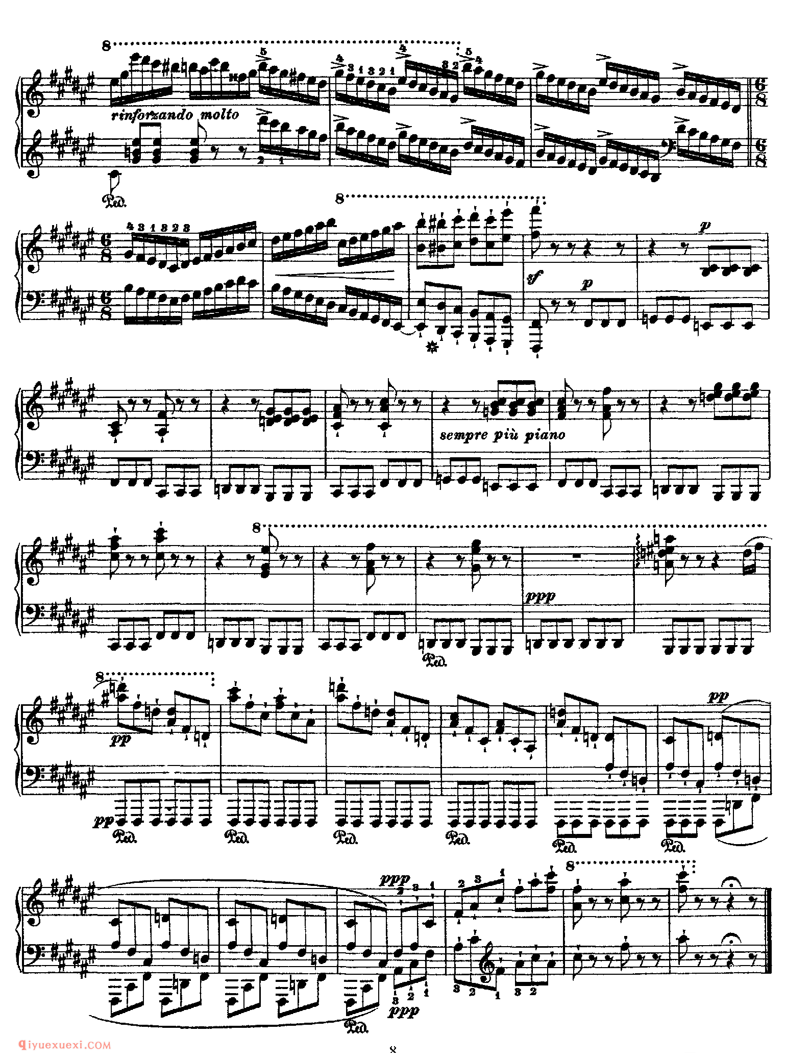 降D大调,甚快板。是一首明朗乐观歌颂大自然的赞歌,音乐中似有微风吹动树叶的沙沙声及请人的喃喃耳语声。从技巧上看,这首练习曲吉中地训练了流 畅,均匀弹奏各种三连音,但在强调这些技术训练的同时,作者又赋予这首作品以鲜明的艺术形象。音乐主题舒展而流畅,一连串下行的进行表现大自然给人们的美 好感受以及陶醉于良辰美景中的人们那种舒畅,激动的心情。