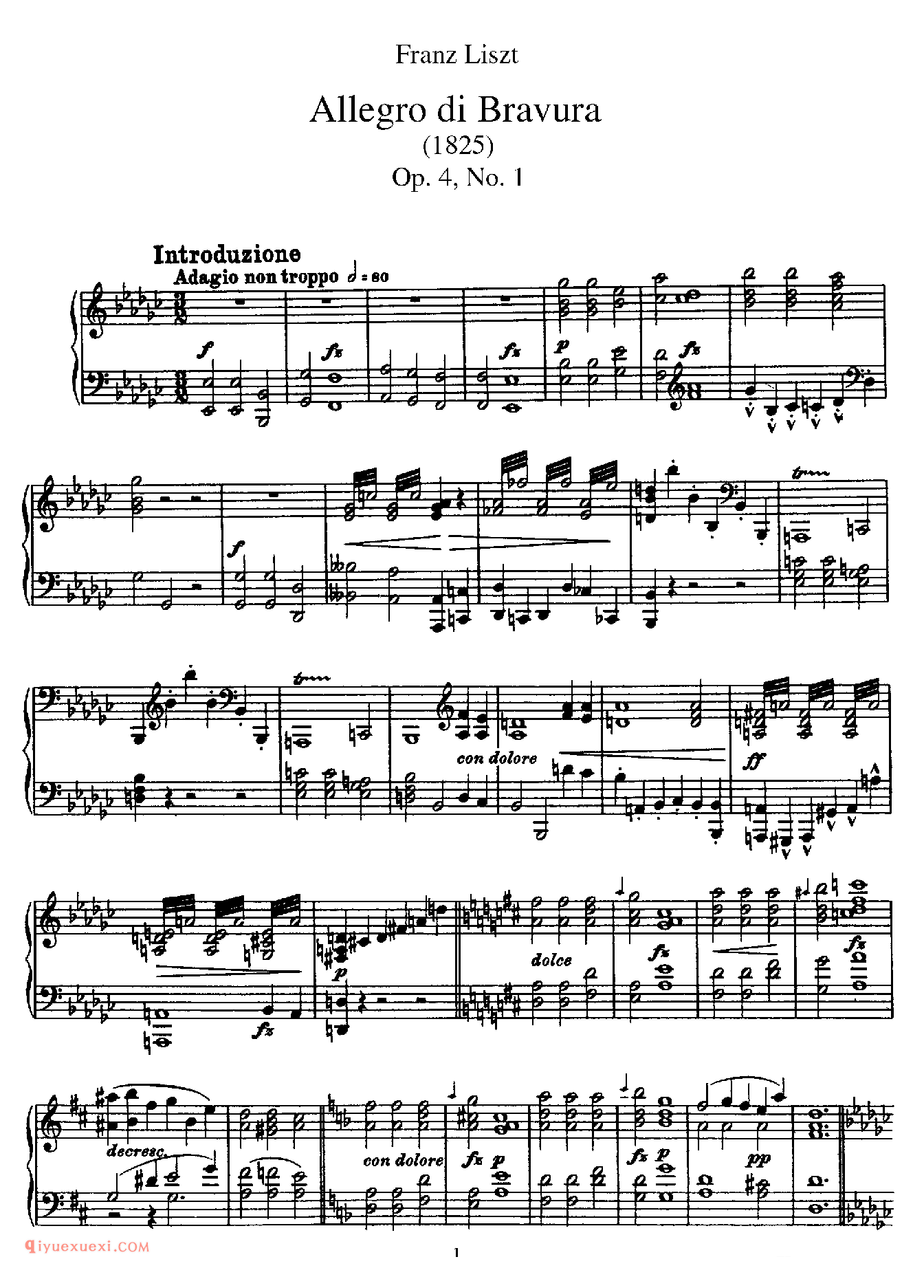 华丽的快板 Allegro di Bravura S.151《华丽的快板》Allegro di Bravura S.151 ,作于1824年,题献给萨德斯·阿马德乌斯伯爵(Thaddeus Amadé)。于1825年出版,编号为 Op.4 No.1 。作品为降E大调,由降e小调不过分的柔板引子引出降E大调的甚快板主题。