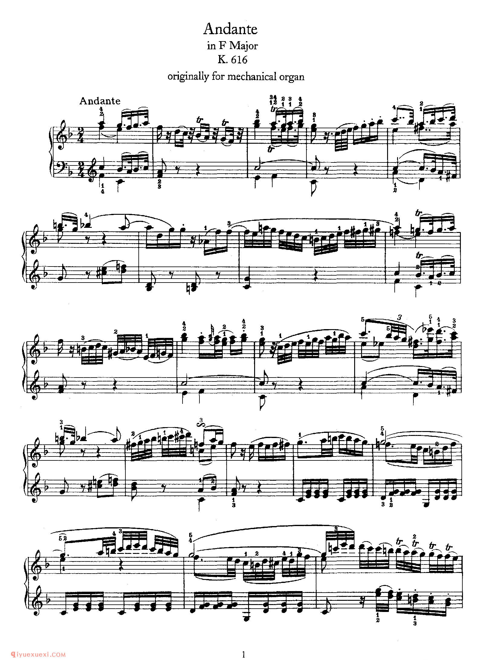Andante in F, K 616_莫扎特钢琴谱高清电子版乐谱歌词图片是器乐学习网于2021年11月30日 19:00:02更新分享的钢琴曲谱;资源收录于钢琴曲谱栏目中;器乐学习网免费分享Andante in F, K 616_莫扎特钢琴谱简谱与五线谱歌谱图片,欢迎在线免费下载;器乐学习网无需注册会员,直接免费下载各类乐器学习资源及乐谱。