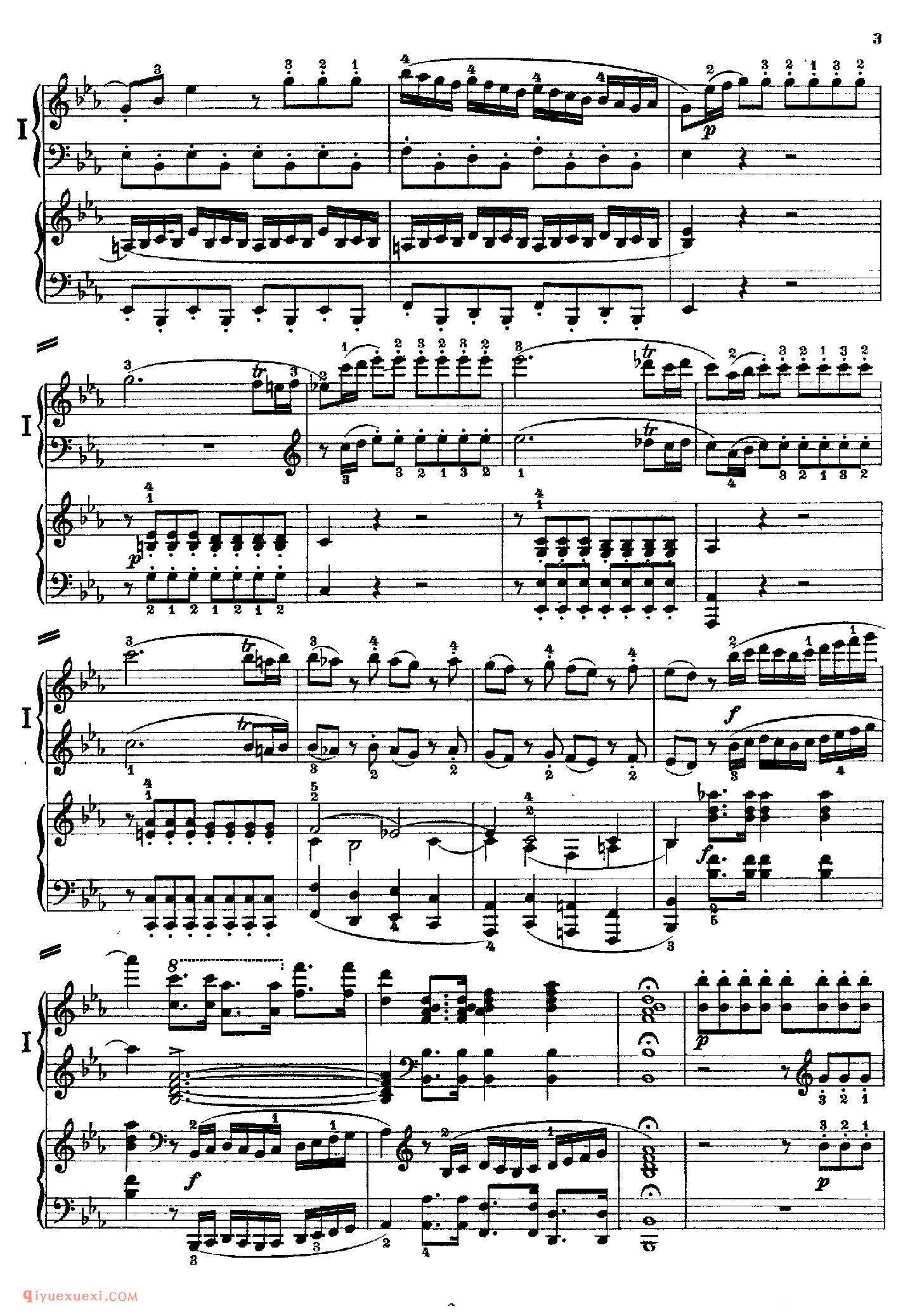 3.回旋曲,快板,降E大调。活泼的回旋主题先由弦乐呈示,合奏反复,突然终止于六度属和弦。乐队终止后,第一钢琴上场呈示副主题;第二钢琴以低八度反复,双簧管构成回声。接着回旋主题动机构成的终结乐句上场后,以16分音符形成的分散和弦及以三连音符构成的乐句,由两架钢琴对话,移向第一插入句。第二插入句由16分音符构成震音音型,以及三连音符构成的旋律,在两架钢琴间不断交换演奏。然后回旋主题和第一插入句再现,利用回旋主题动机谱成的终结乐句上场,导向华彩。这华彩是莫扎特亲笔所作,回旋主题再现而结束。