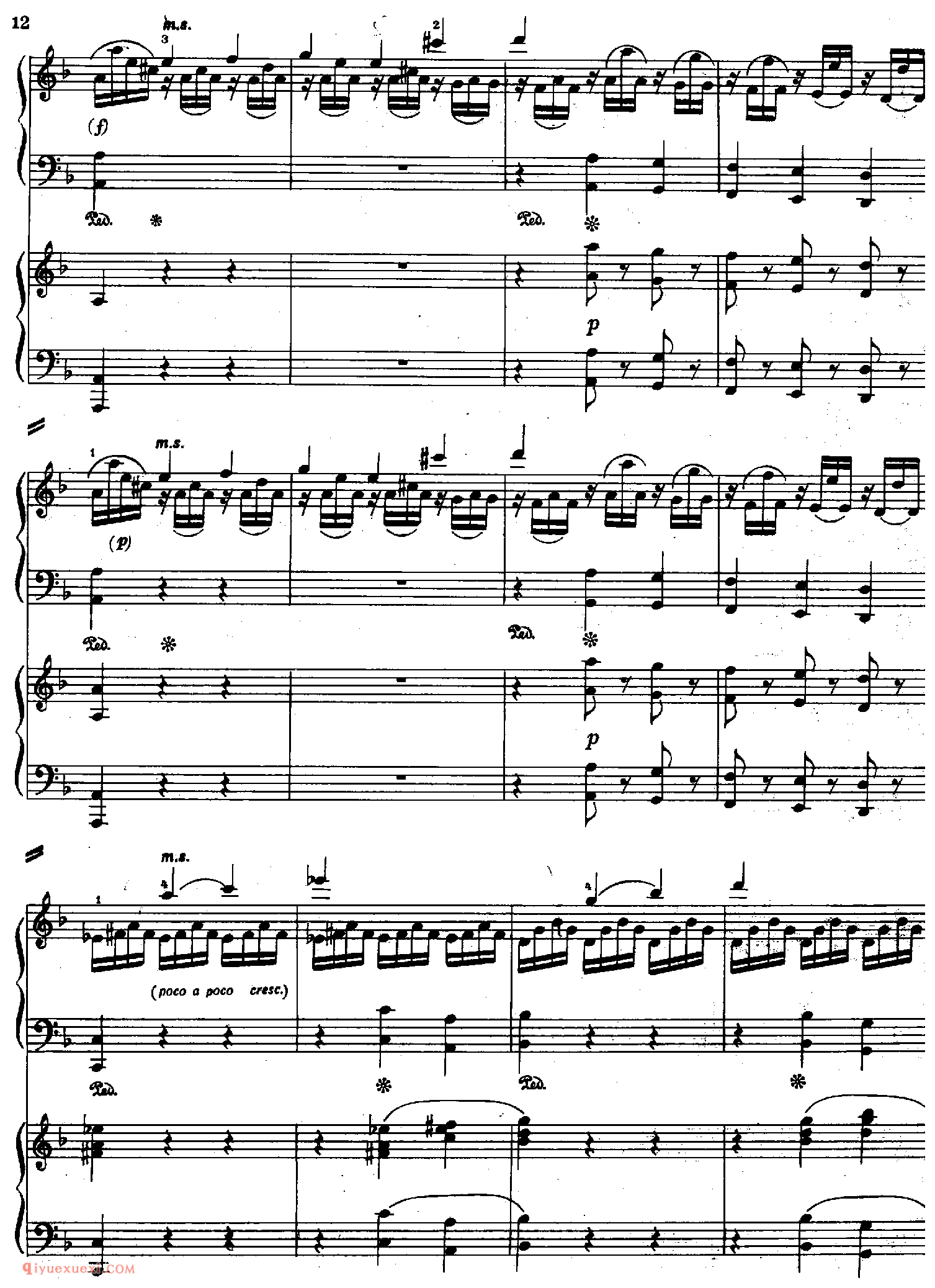 3.小步舞曲速度,F大调,回旋曲式。开头以乐队奏32小节回旋曲主题为小步舞曲形态。乐队之后主奏把主题单纯地变奏。主题的前后半段分别被主奏钢琴、乐队或弦乐队以变化反复。回旋曲和第二段以高四度反复新要素而转成降B大调,非常优美。第三段达成尾奏效果,主题在最后作各种各样变奏,弦乐奏主题,钢琴以四度音程及辉煌的音阶回应,强有力的合奏推向高潮,圆号再奏主题,钢琴回应,双簧管再回应,构成美丽的回声。
