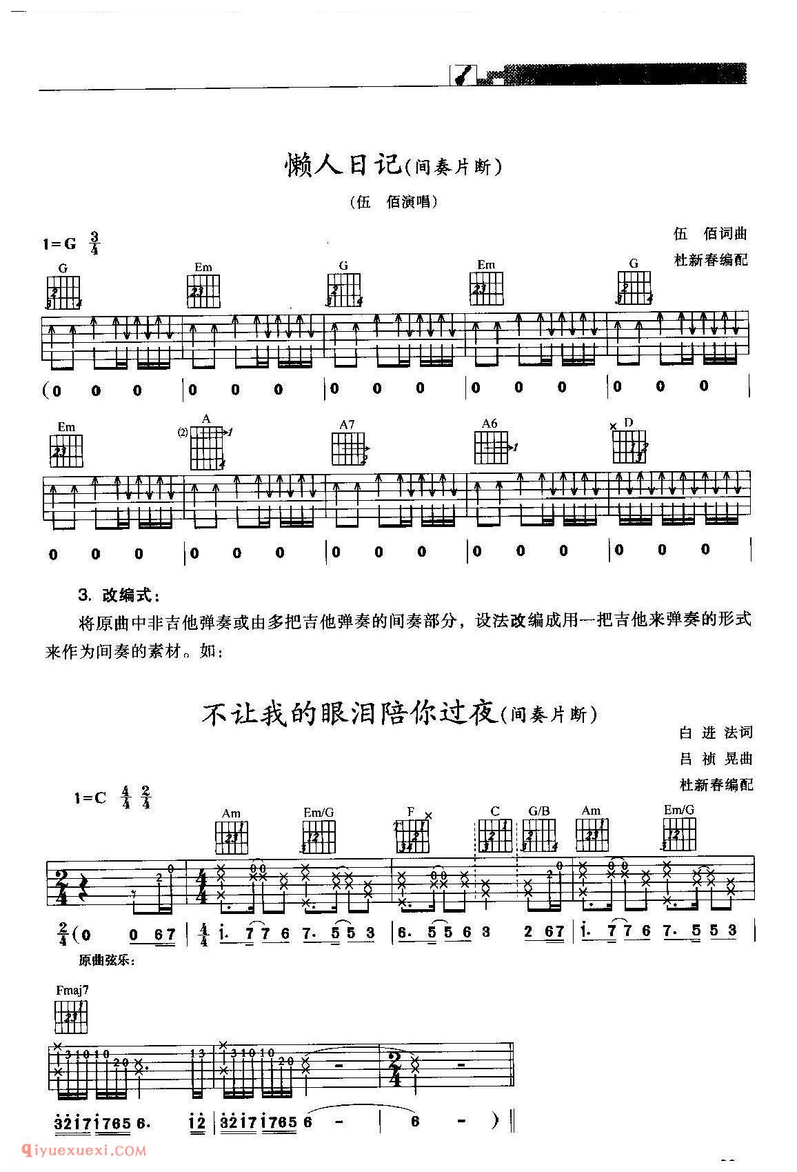 从原则上讲,凡是旋律上口,内容健康向上的歌曲均可进行吉他弹唱。但是,受风格,演唱形式以及乐器的不同表现特点所限,决定了不是所有歌曲都可以进行吉他弹唱的。谈到这点,我想发表-一下个人的看法。现在,普遍朋友在选歌方面都或多或少地存在着一些盲目性。他(她)们的宗旨是:不管歌曲是否适合吉他弹唱,只要是风格偏重(如重金属风格),偏怪(如;R&B.Hip-hop风格)就行。在他(她)们看来:“重"代表过瘾;“怪"代表时尚。其实,这恰恰就是吉他弹唱的误区。真正的吉他弹唱应该是一种情感的释放,面并非那种声嘶力竭和无病呻吟。因此,正确的选歌很重要。