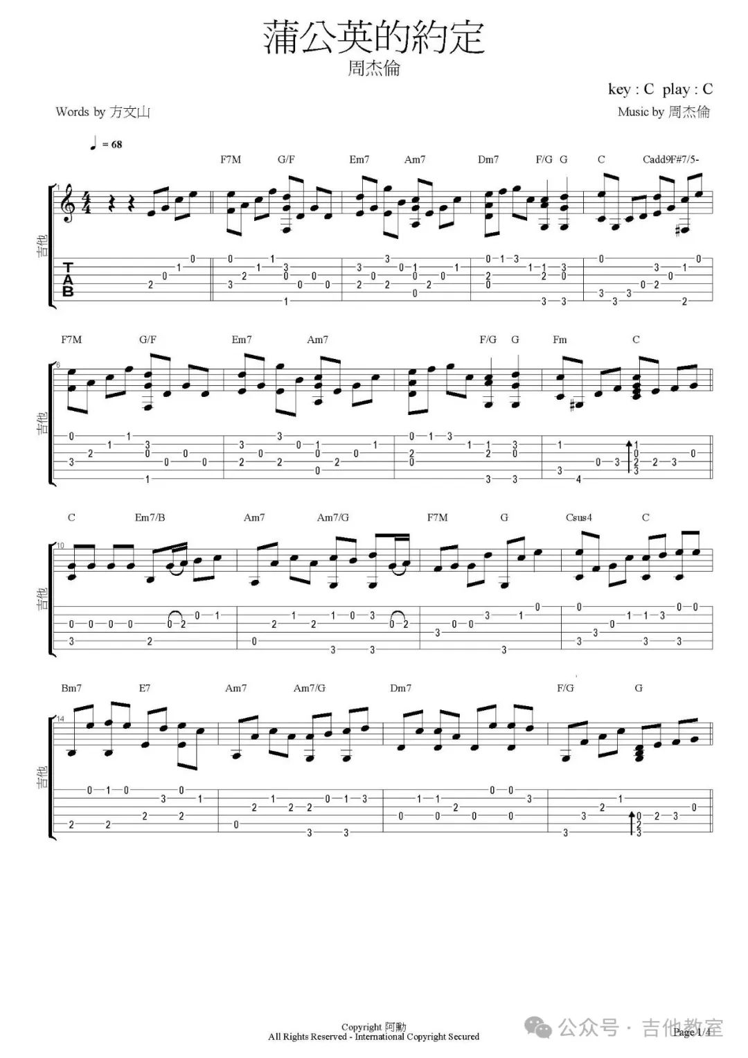 周杰伦《蒲公英的约定》吉他指弹谱高清电子版乐谱歌词图片是器乐学习网于2024年05月21日 19:02:51更新分享的吉他曲谱;资源收录于吉他曲谱栏目中;器乐学习网免费分享周杰伦《蒲公英的约定》吉他指弹谱简谱与五线谱歌谱图片,欢迎在线免费下载;器乐学习网无需注册会员,直接免费下载各类乐器学习资源及乐谱。