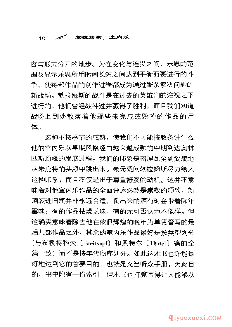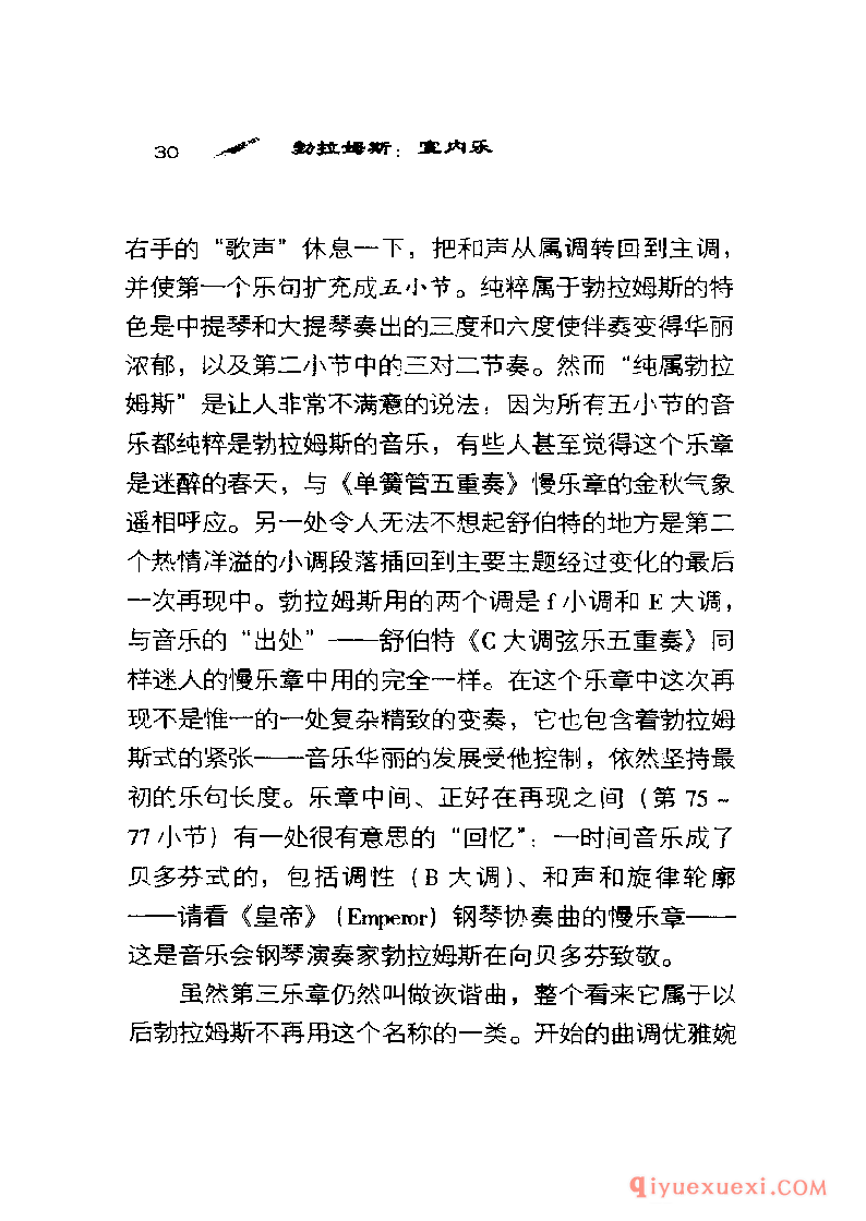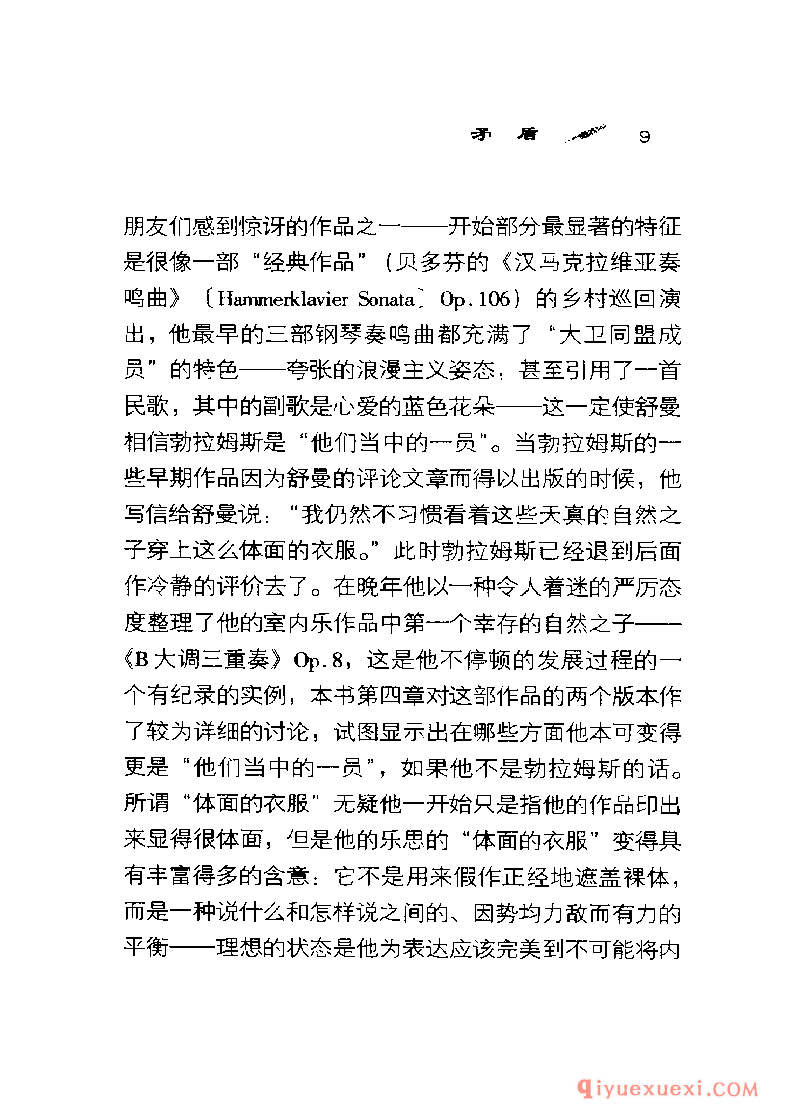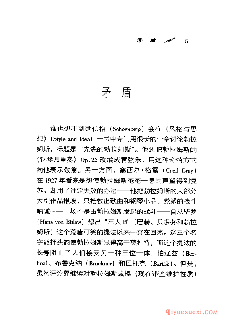 谁也想不到勋伯格〈 Schoenberg)会在《风格与思想》( Style and Idea)一书中专门用很长的一章讨论勃拉姆斯,标题是“先进的勃拉姆斯"。他还把勃拉姆斯的《钢琴四重奏》Op.25改编成管弦乐,用这种奇特方式向他表示敬意。另一方面,塞西尔·格雷( CecilGray )在1927年看来是想使勃拉姆斯奄奄一息的声望得到复苏,却用了注定失败的办法-—他把勃拉姆斯的大部分大型作品报废,只抢救出歌曲和钢琴小品。党派的战斗呐喊―—一-场不是由勃拉姆斯发起的战斗—―自从毕罗(Hans von Biilow)想出“三大B”(巴赫、贝多芬和勃拉姆斯)这个荒唐可笑的提法以来一直在回荡。这三个名字能押头韵使勃拉姆斯显得高于莫扎特,而这个提法的长寿阻止了人们接受另一种三位一体:柏辽兹( Ber-lioz)、布鲁克纳〈 Bruckner)和巴托克( Bartok ) 。