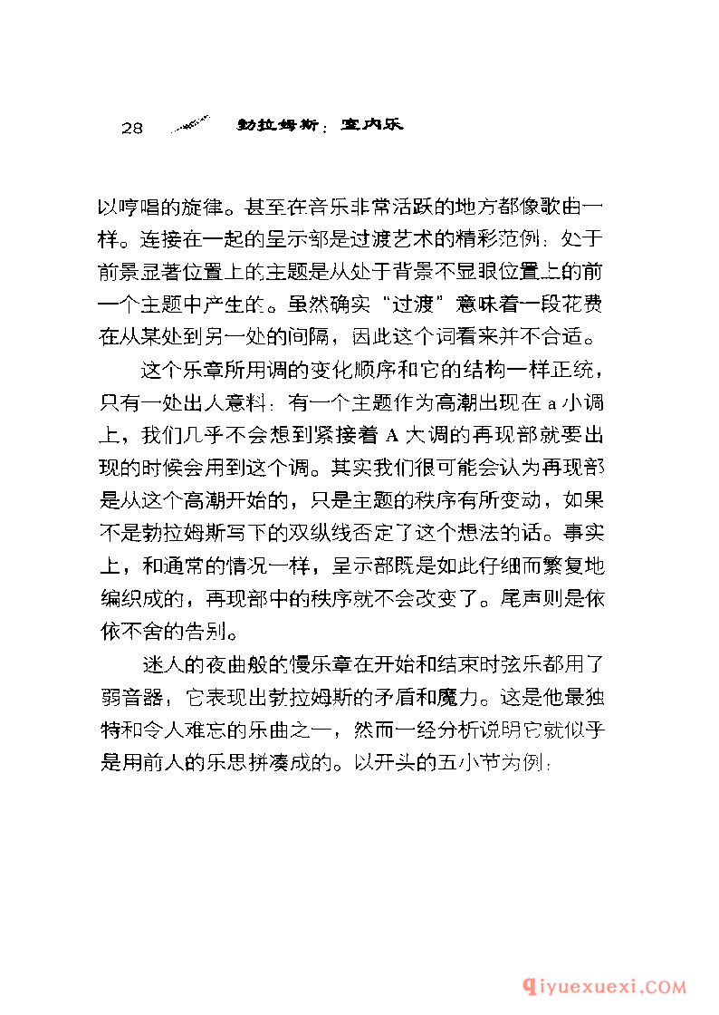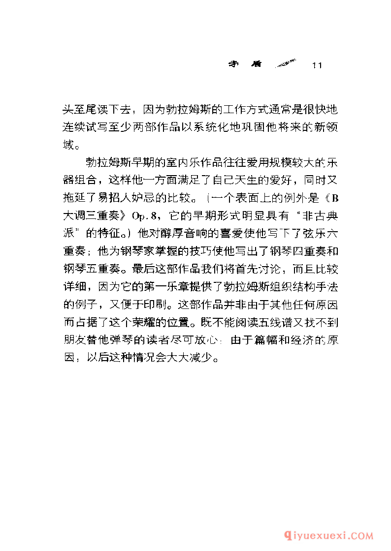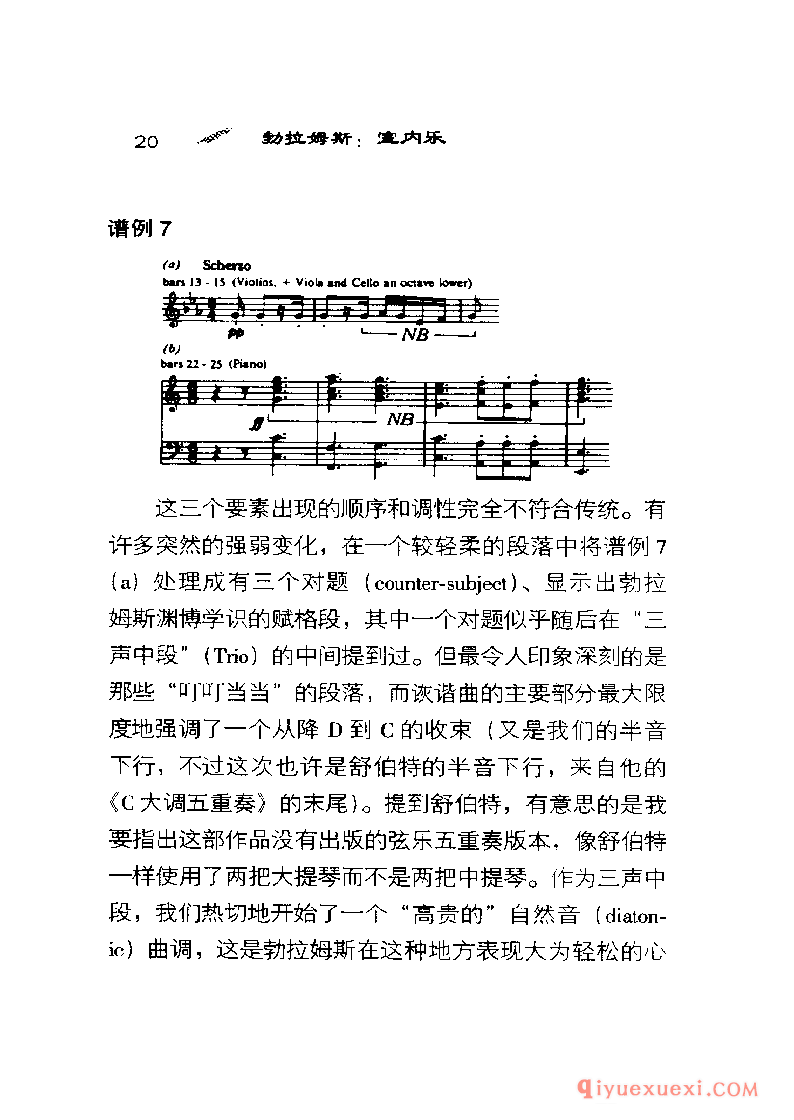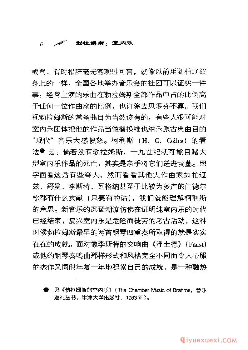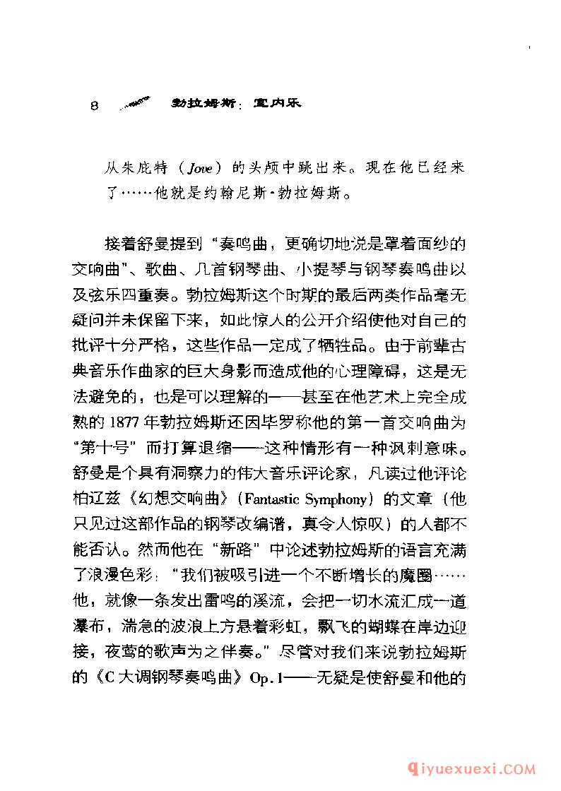 谁也想不到勋伯格〈 Schoenberg)会在《风格与思想》( Style and Idea)一书中专门用很长的一章讨论勃拉姆斯,标题是“先进的勃拉姆斯"。他还把勃拉姆斯的《钢琴四重奏》Op.25改编成管弦乐,用这种奇特方式向他表示敬意。另一方面,塞西尔·格雷( CecilGray )在1927年看来是想使勃拉姆斯奄奄一息的声望得到复苏,却用了注定失败的办法-—他把勃拉姆斯的大部分大型作品报废,只抢救出歌曲和钢琴小品。党派的战斗呐喊―—一-场不是由勃拉姆斯发起的战斗—―自从毕罗(Hans von Biilow)想出“三大B”(巴赫、贝多芬和勃拉姆斯)这个荒唐可笑的提法以来一直在回荡。这三个名字能押头韵使勃拉姆斯显得高于莫扎特,而这个提法的长寿阻止了人们接受另一种三位一体:柏辽兹( Ber-lioz)、布鲁克纳〈 Bruckner)和巴托克( Bartok ) 。