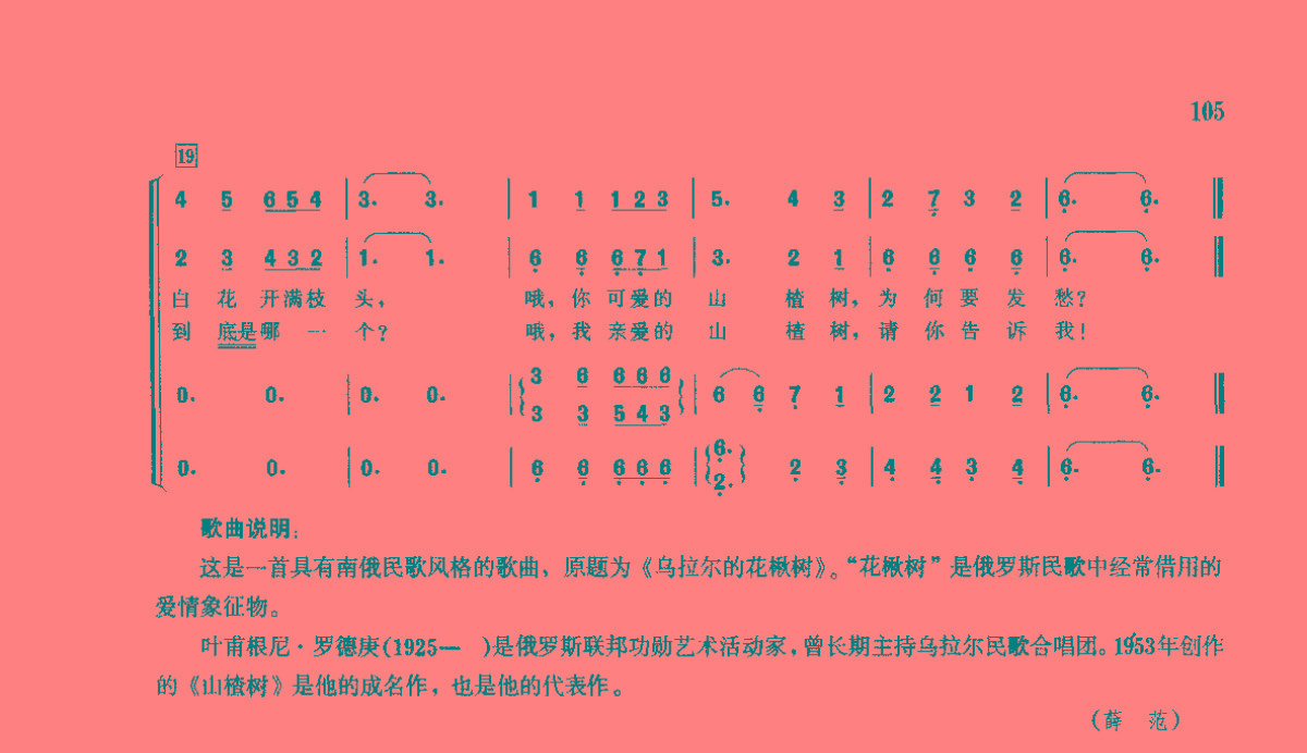 这是一首具有南俄民歌风格的歌曲,原题为《乌拉尔的花楸树》。“花楸树”是俄罗斯民歌中经常借用的爱情象征物。