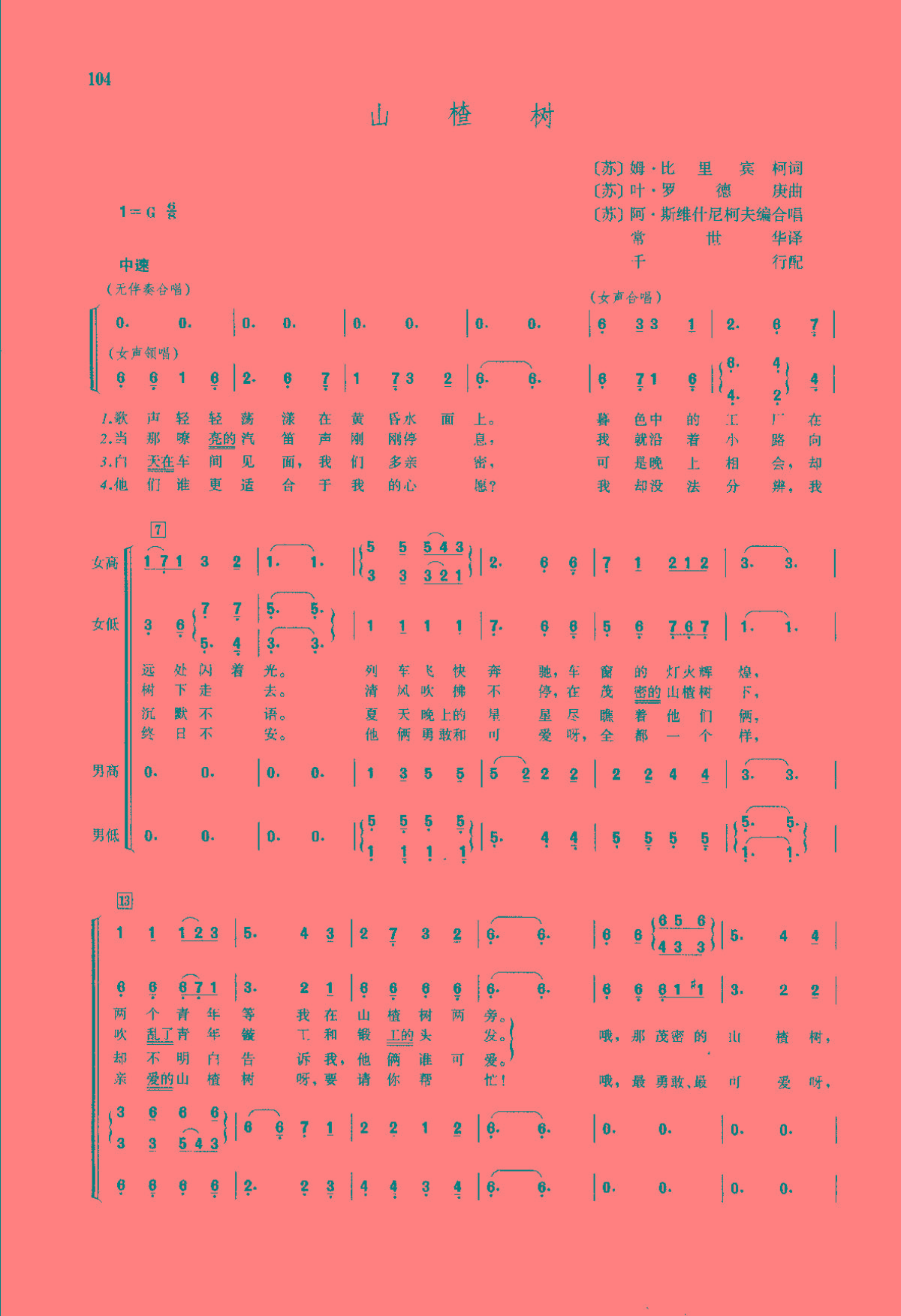 山楂树 [苏] 姆·比里宾柯词 [苏] 叶·罗德庚曲 [苏] 阿·斯维什尼柯夫编合唱高清简谱歌词是器乐学习网于2025年01月07日 16:04:09更新分享的合唱歌谱;资源收录于合唱歌谱栏目中;器乐学习网免费分享山楂树 [苏] 姆·比里宾柯词 [苏] 叶·罗德庚曲 [苏] 阿·斯维什尼柯夫编合唱简谱与五线谱歌谱图片,欢迎在线免费下载;器乐学习网无需注册会员,直接免费下载各类乐器学习资源及乐谱。