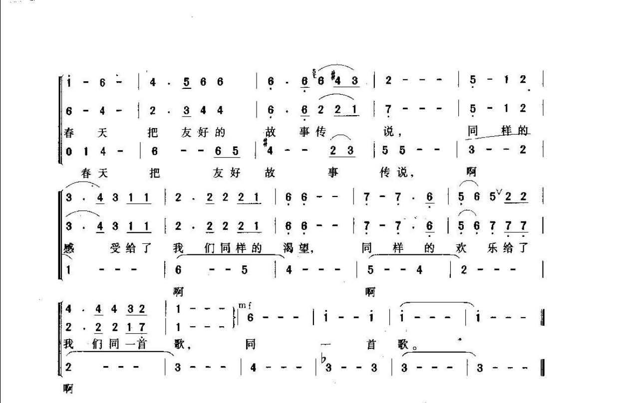 同一首歌 陈哲 胡迎节词 孟卫东曲 李炳富编合唱高清简谱歌词是器乐学习网于2025年01月08日 09:07:07更新分享的少儿歌谱;资源收录于少儿歌谱栏目中;器乐学习网免费分享同一首歌 陈哲 胡迎节词 孟卫东曲 李炳富编合唱简谱与五线谱歌谱图片,欢迎在线免费下载;器乐学习网无需注册会员,直接免费下载各类乐器学习资源及乐谱。