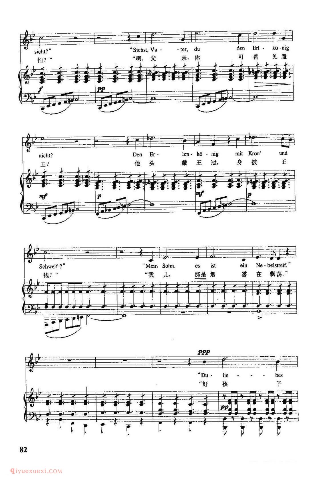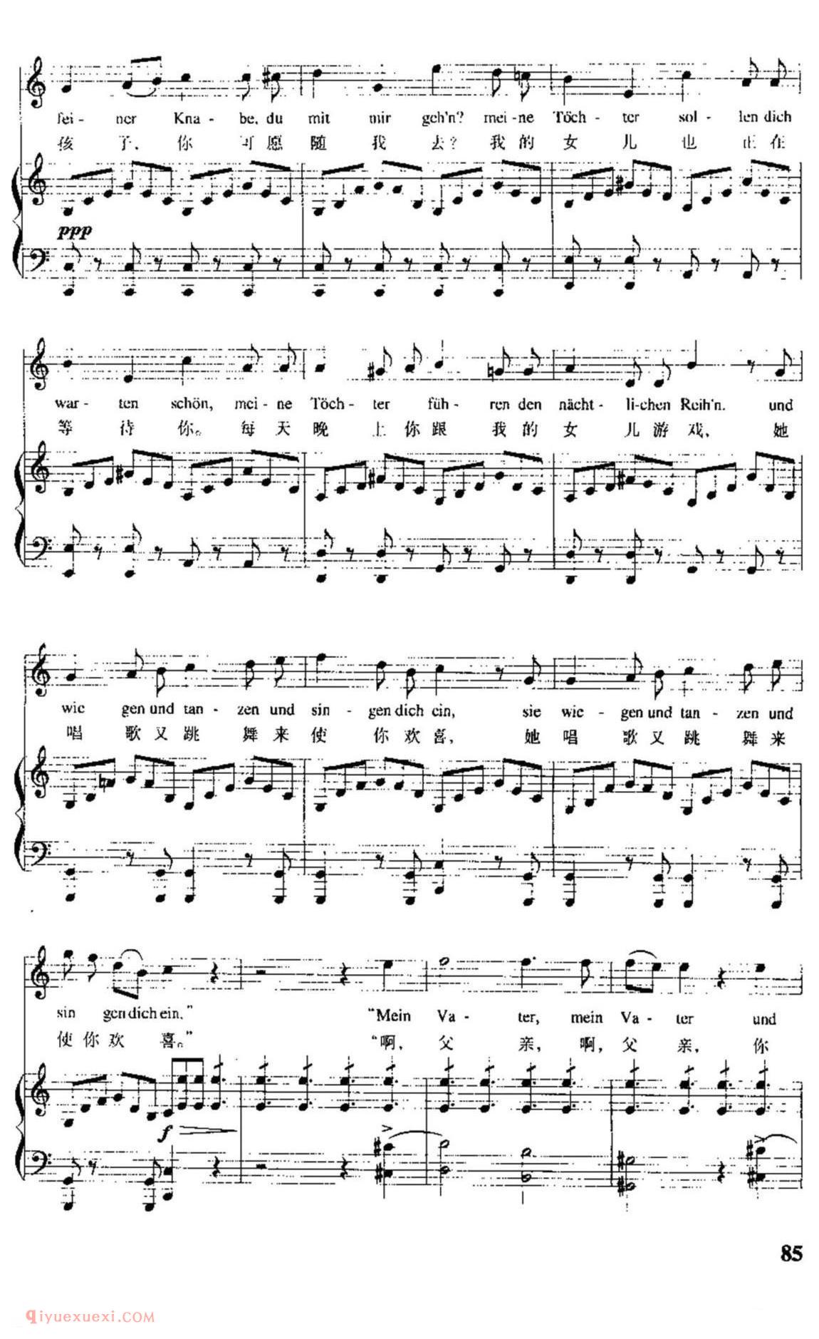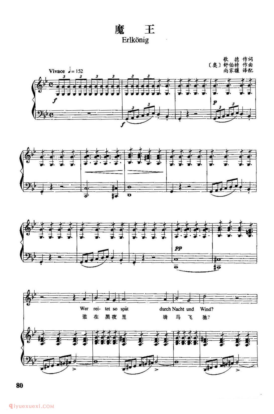 奥地利作曲家舒伯特根据歌德同名诗创作,作于1815年。当时作者只有18岁,这首叙事曲被编为作品第1号。全诗的故事情节:父亲怀抱发高烧的孩子在黑夜的森林里骑着马飞驰,森林中的魔王不断引诱孩子,孩子发出阵阵惊呼,最后终于在父亲怀抱中死去。歌曲采用通谱手法,一气呵成,气势宏大。诗歌中叙述者、父亲、孩子及魔王四个不同角色由不同的音调体现出来。作者充分展示了戏剧性的情节,如钢琴伴奏模拟马蹄疾奔的节奏贯穿全曲,低音奏出的风声描绘出夜幕中的森林冷风飒讽、咄咄逼人的情景,烘托出沉闷恐惧的气氛。作者还以小二度上行模仿孩子的惊呼,形象地刻画出孩子愈加惊恐的神情。