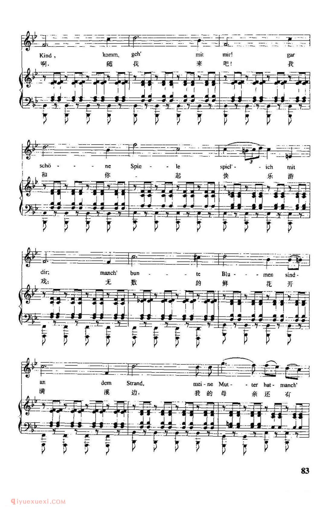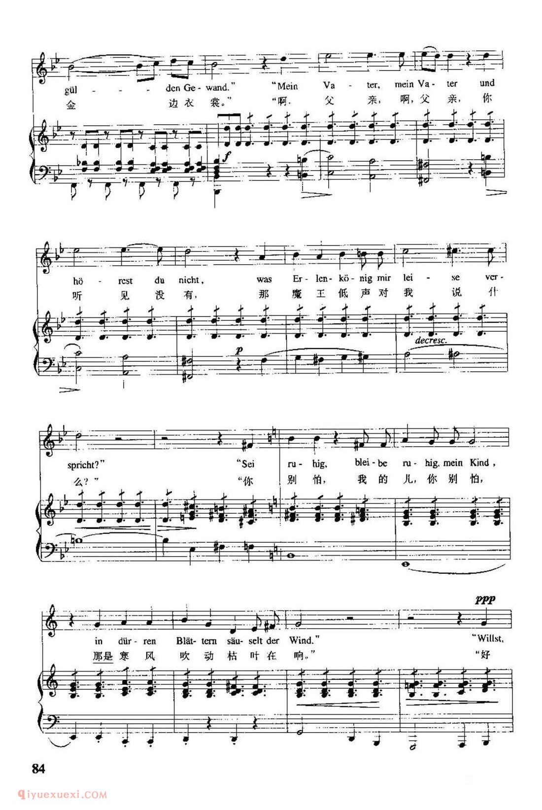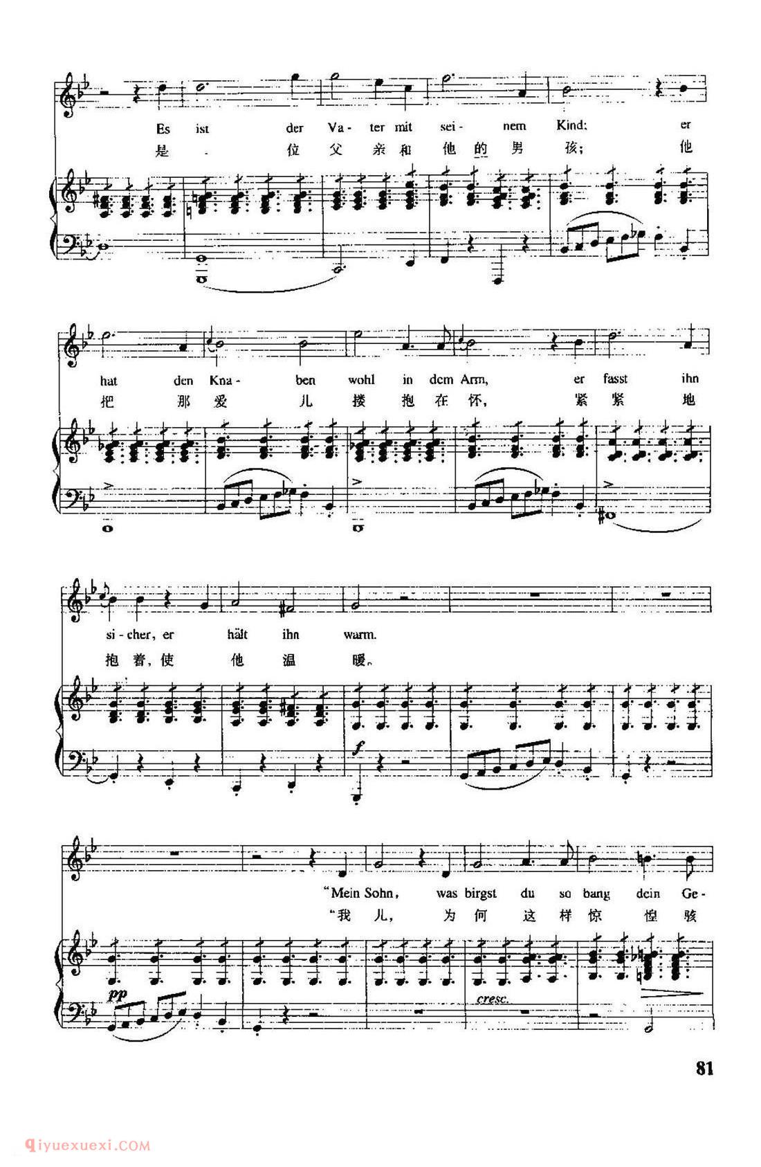 奥地利作曲家舒伯特根据歌德同名诗创作,作于1815年。当时作者只有18岁,这首叙事曲被编为作品第1号。全诗的故事情节:父亲怀抱发高烧的孩子在黑夜的森林里骑着马飞驰,森林中的魔王不断引诱孩子,孩子发出阵阵惊呼,最后终于在父亲怀抱中死去。歌曲采用通谱手法,一气呵成,气势宏大。诗歌中叙述者、父亲、孩子及魔王四个不同角色由不同的音调体现出来。作者充分展示了戏剧性的情节,如钢琴伴奏模拟马蹄疾奔的节奏贯穿全曲,低音奏出的风声描绘出夜幕中的森林冷风飒讽、咄咄逼人的情景,烘托出沉闷恐惧的气氛。作者还以小二度上行模仿孩子的惊呼,形象地刻画出孩子愈加惊恐的神情。