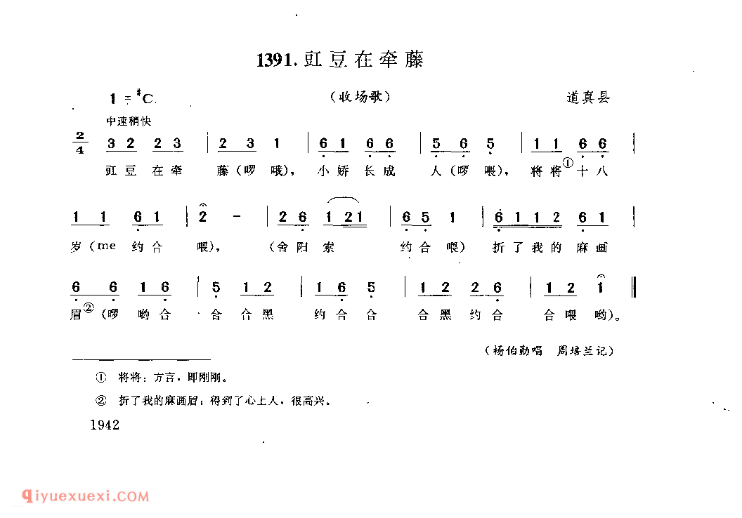 豇豆在牵藤(收场歌) 道真县_劳动山歌_贵州民间歌曲简谱