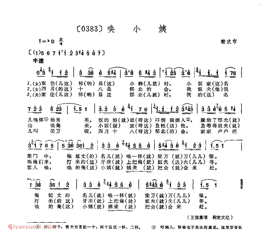 唤小姨&榆次市_秧歌_山西民间歌曲简谱