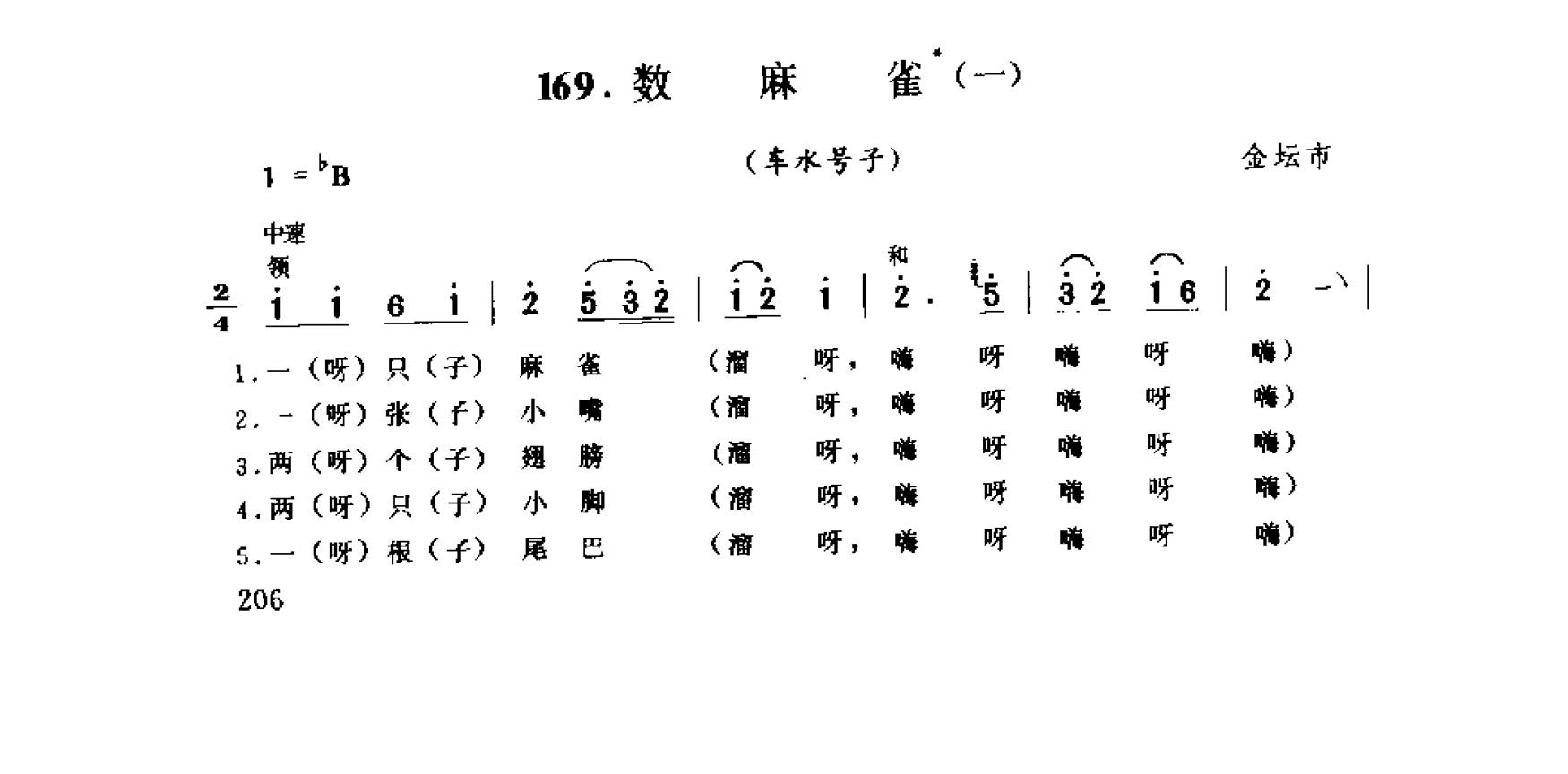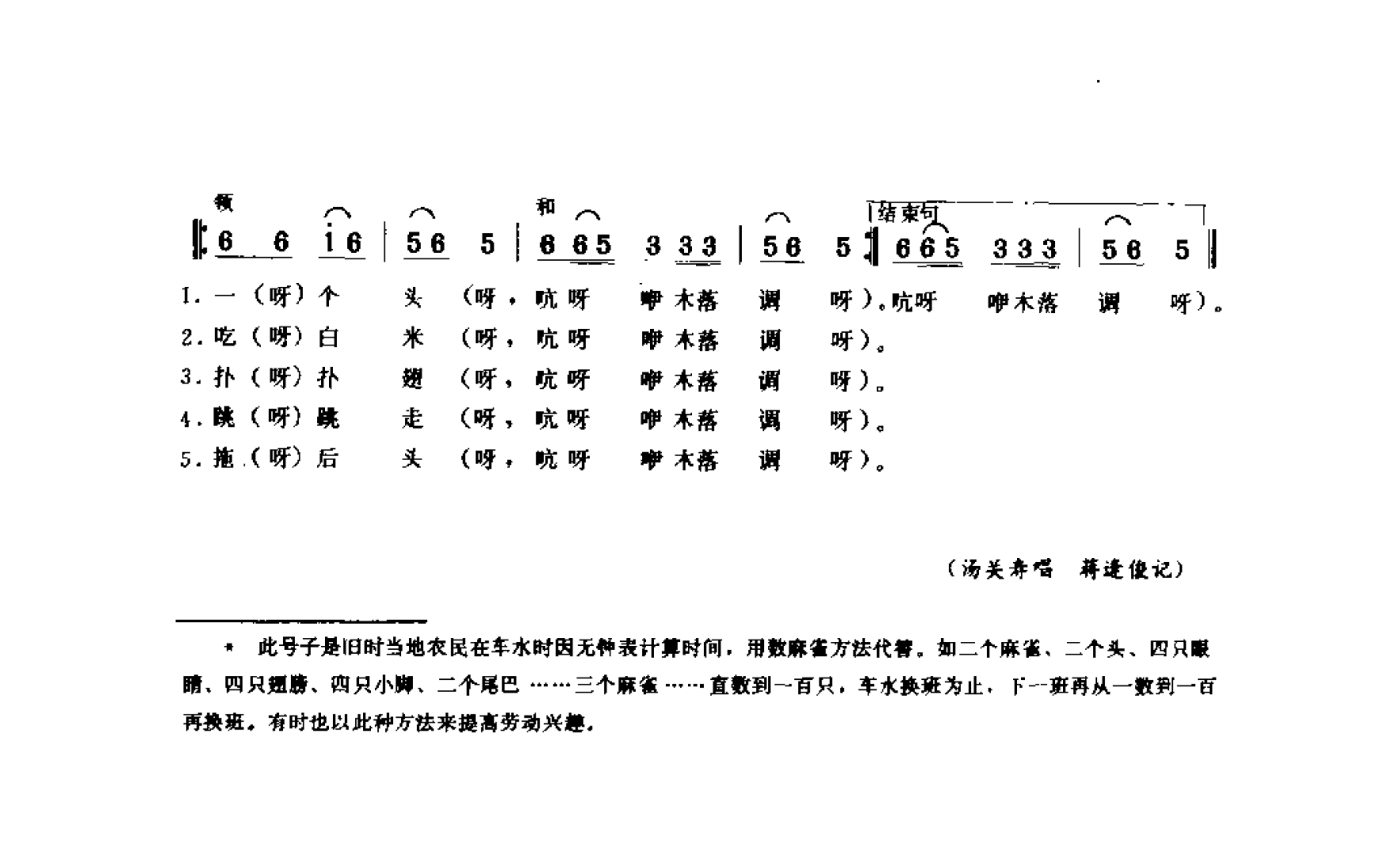 此号子是旧时当地农民在车水时因无种表计算时间,用数麻雀方法代答。如二个麻、二个头、四只眼睛、四只通膀、四只小脚、二个尾巴……三个麻蜜……直数到一百只,车水换班为止,下--班再从一數到一百再换班。有时也以此种方法来提高劳动兴趣
