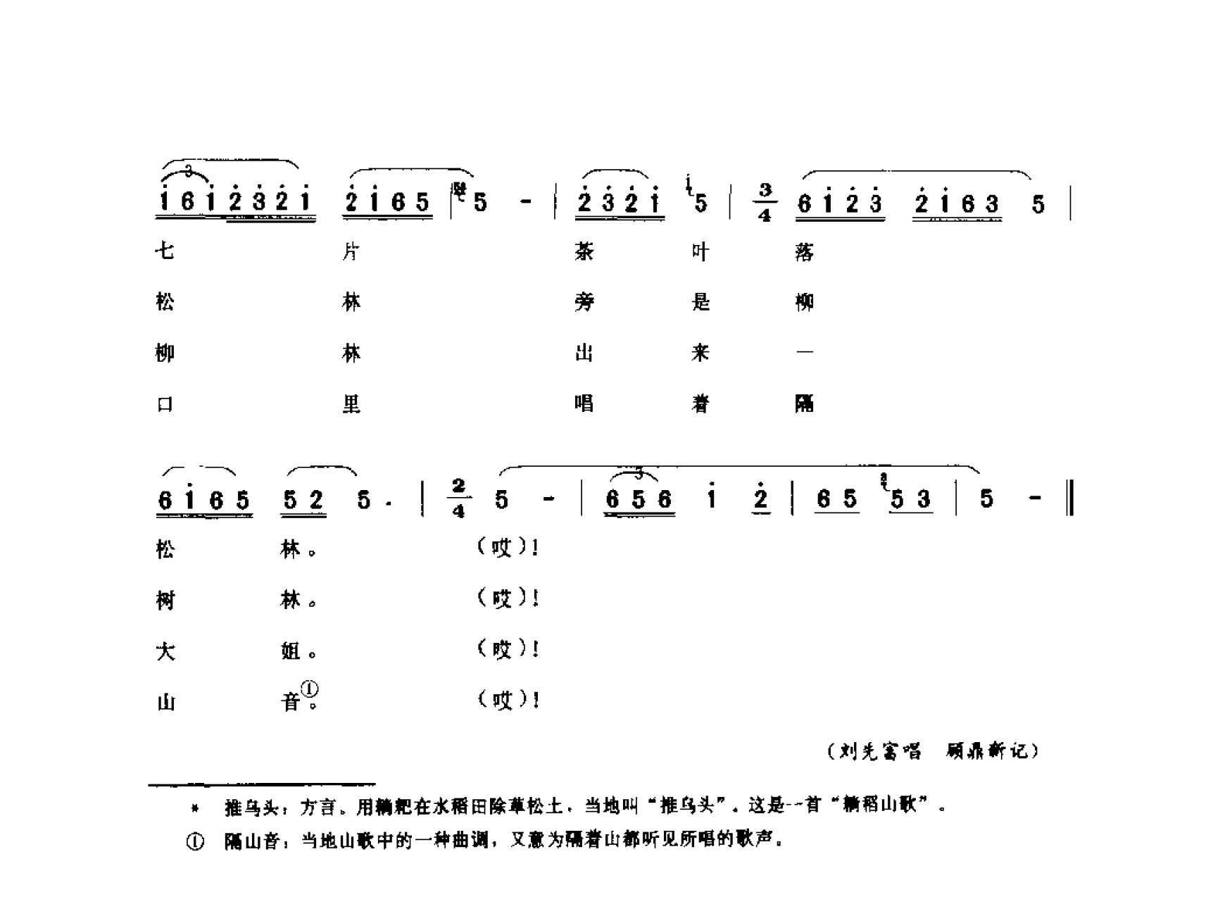 推乌头:方言。用耥耙在水稻田除草松土,当地叫“推乌头”。这是--首“精稻山歌 ① 隔山音:当地山歌中的一种曲调,又意为隔着山都听见所唱的歌声。