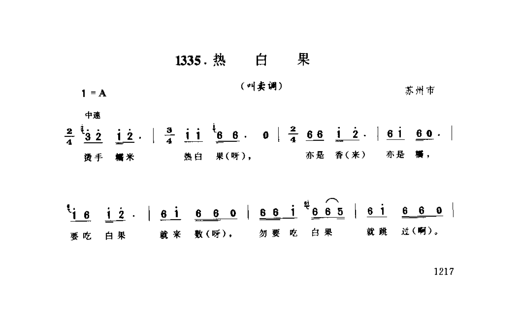 生活音调:热白果(叫卖调) 苏州市高清简谱歌词是器乐学习网于2024年12月26日 11:18:48更新分享的民歌曲谱;资源收录于民歌曲谱栏目中;器乐学习网免费分享生活音调:热白果(叫卖调) 苏州市简谱与五线谱歌谱图片,欢迎在线免费下载;器乐学习网无需注册会员,直接免费下载各类乐器学习资源及乐谱。